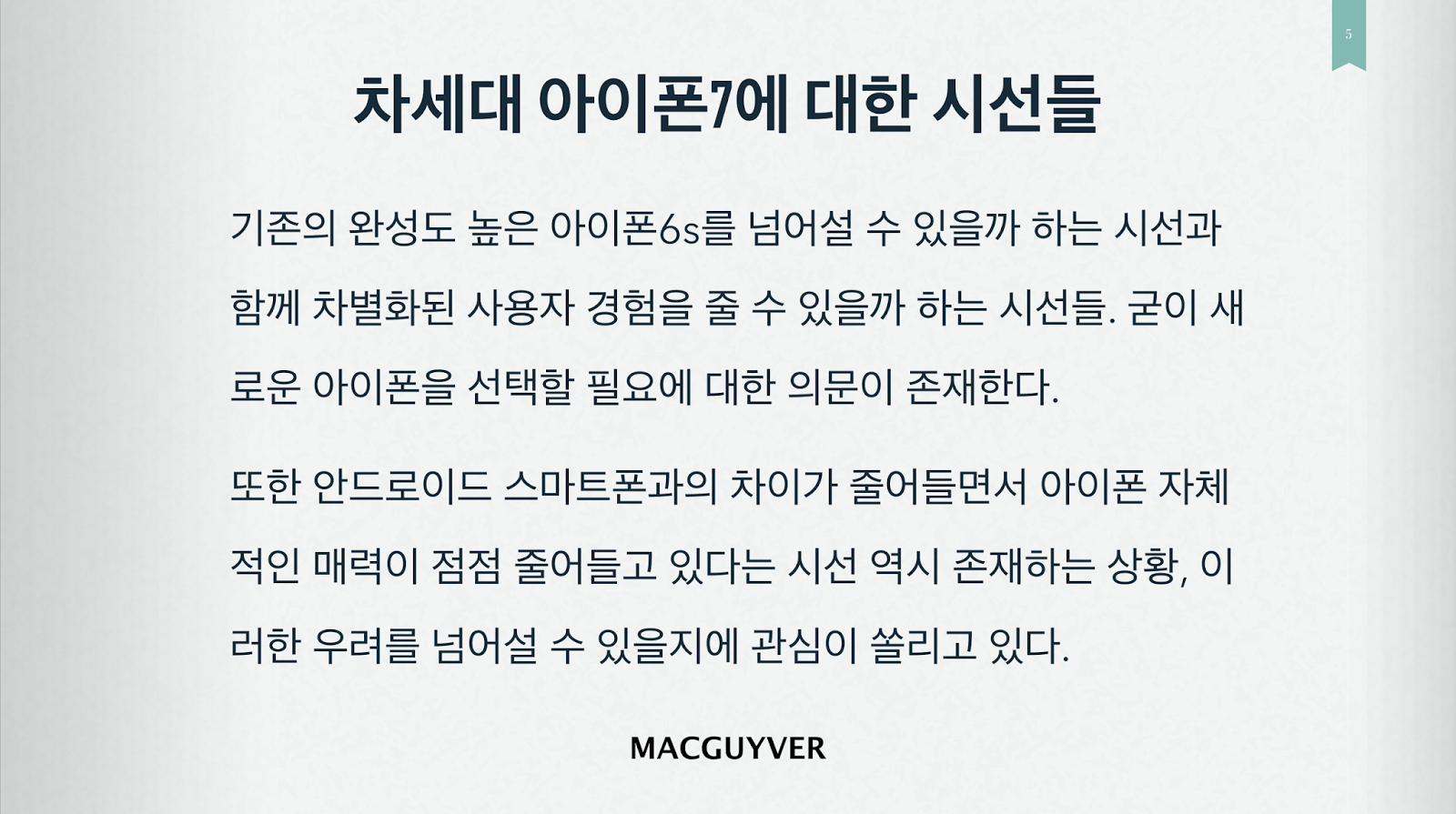 차기 아이폰은 기존의 단점들을 극복하고, 전혀 다른 새로움과 놀라움을 줄 가능성이 많아 보이는 만큼, 또한 그만큼이나 경쟁사의 기술 역시 만만치 않은 만큼, 올가을의 스마트폰 대전은 유난히 뜨거울 것으로 보인다. - MACGUYVER.