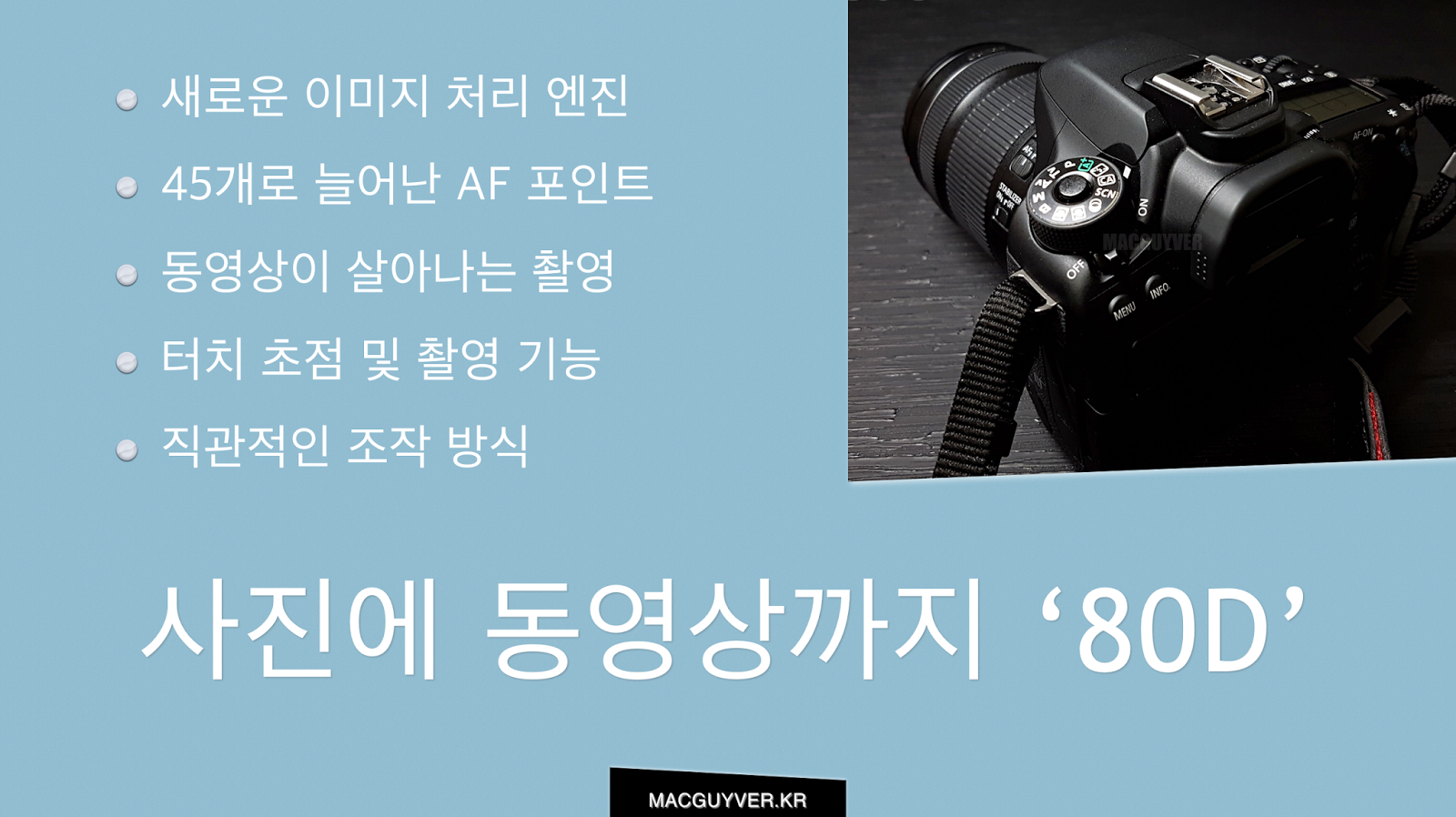 그래서 최근에 등장하는 DSLR은 하나같이 고화소, 저조도, 동영상에 강화되는 모습을 보여주고 있는데, 그 가운데서도 오늘 만나볼 제품은 EOS 80D 모델로서 따끈따끈한 신모델이다.
