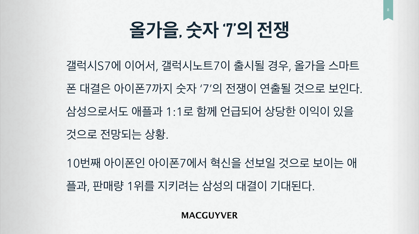 상반기, 이미 갤럭시S7의 효과로 인해 1분기에만 8,100만대의 스마트폰을 판매한 삼성이 이러한 인기를 끌어갈 새로운 플래그십 스마트폰으로 갤럭시노트7에 올인을 한다면, 올가을 스마트폰 대전은 여느 때보다도 뜨거울 것 같다. - MACGUYVER.