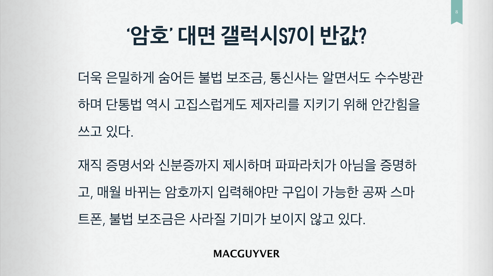 이제는 똑똑한 소비자가 저렴하게 구입하는 것이 아닌, 불법적인 방법을 찾아야만 저렴하게 구입할 수 있는 ‘신 경제’를 만들어낸 것도 대단해 보이는 현실, 암호까지 대면서 구입해야 하는 스마트폰 시장이 한심하기만 하다. - MACGUYVER.