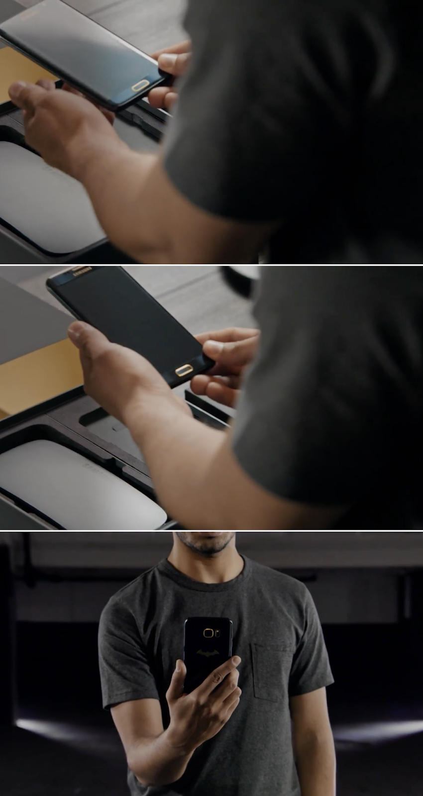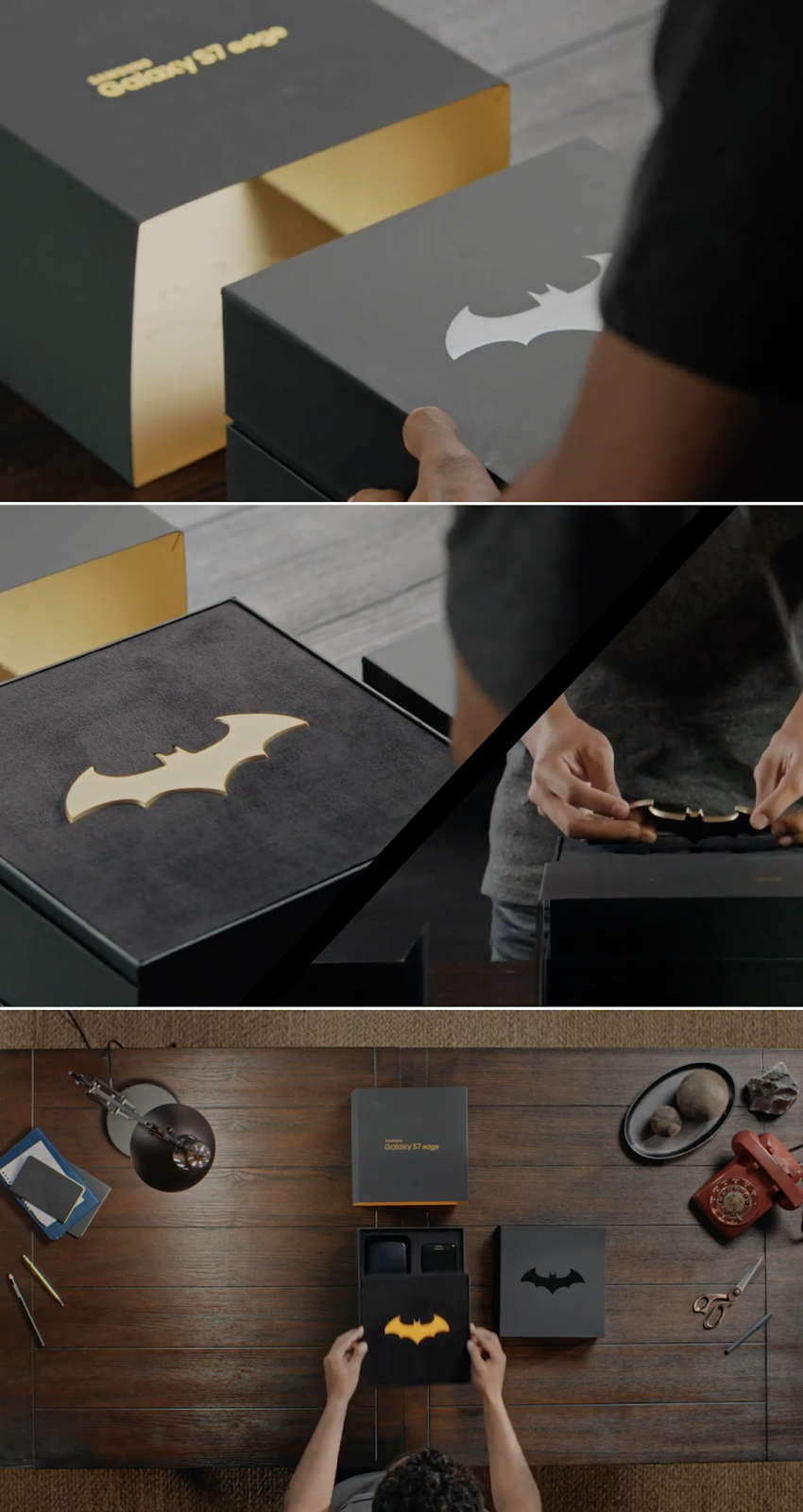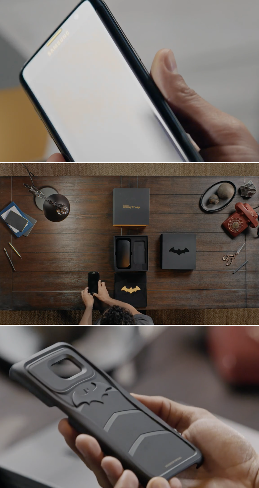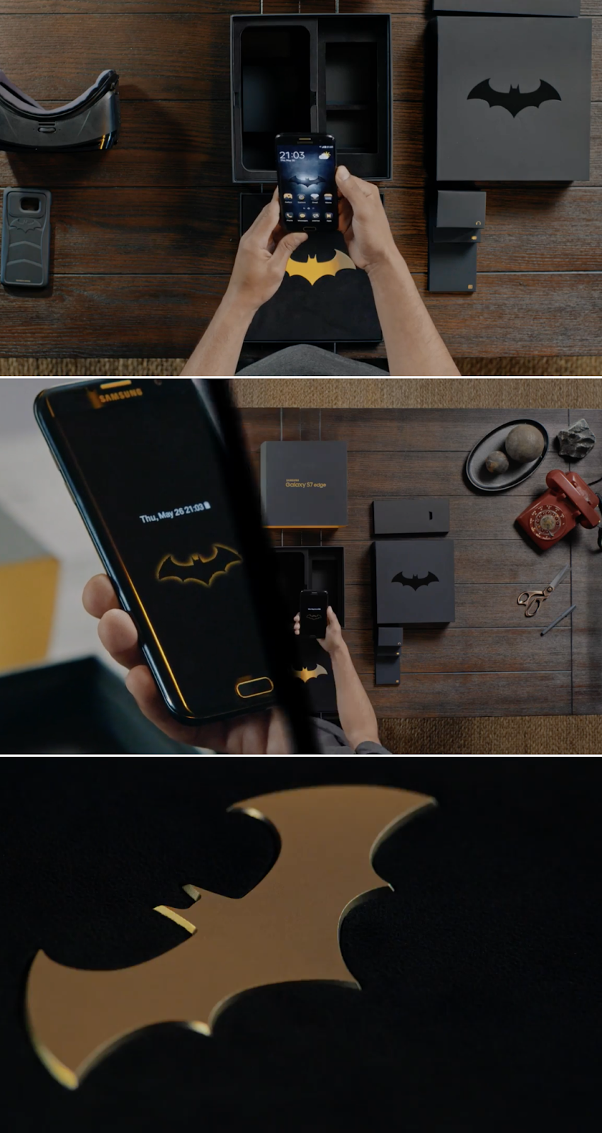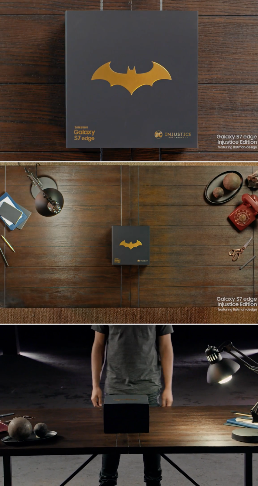 배트맨 로고가 돋보이는 블랙 박스에 담긴 갤럭시S7 엣지 인저스티스 에디션 ▼