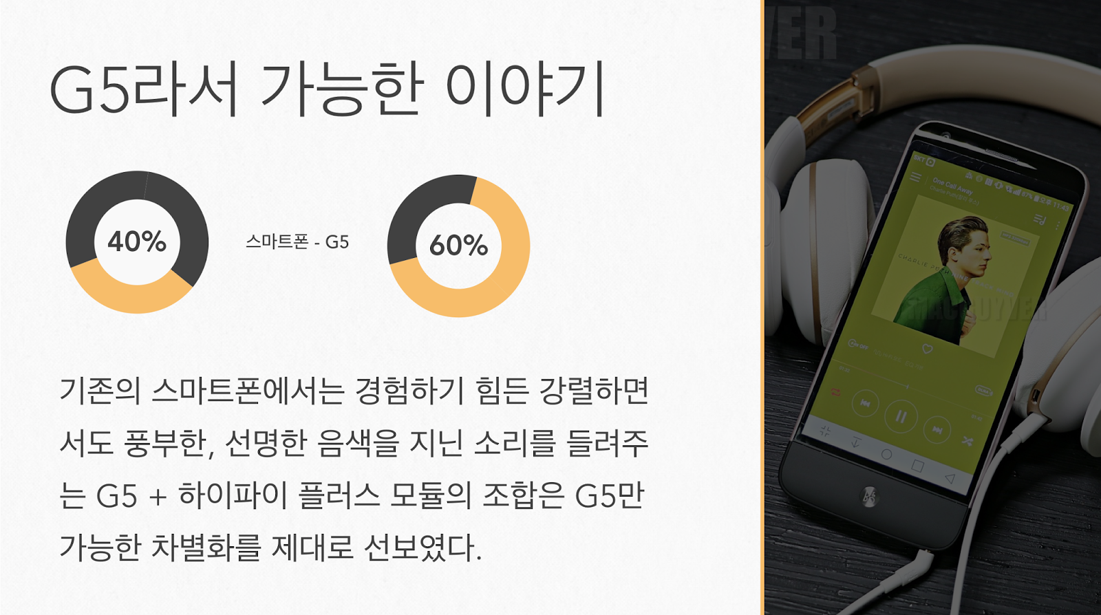 엘지 로고까지 양보하면서 새겨둔 B&O 로고가 고급스러움을 더하는 하이파이 플러스 모듈은 이미 현존하는 스마트폰의 음질 가운데 G5를 정점에 서 있게 만들어주는 기특한 녀석이 된 것 같았다.