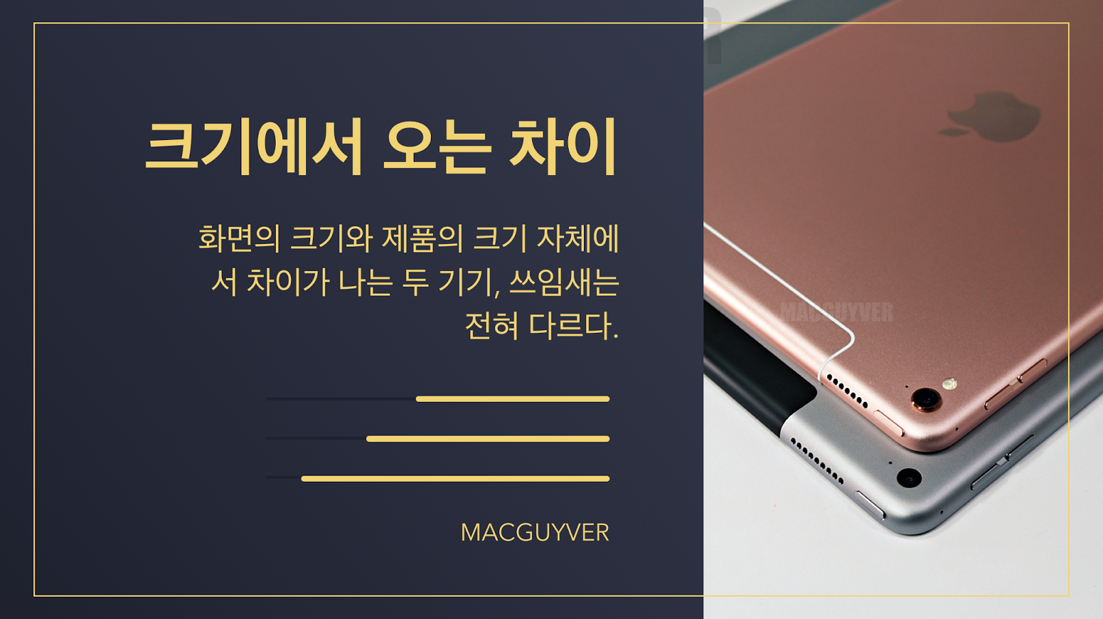 쓰임새가 전혀 다른 9.7형과 12.9형 아이패드 프로, 과연 올가을 7.9형 아이패드 프로가 등장하게 될지, 그것도 아니면 더욱 얇아지고 휴대성이 좋아진 아이패드 에어3가 등장하게 될지 지켜봐야겠다. - MACGUYVER.