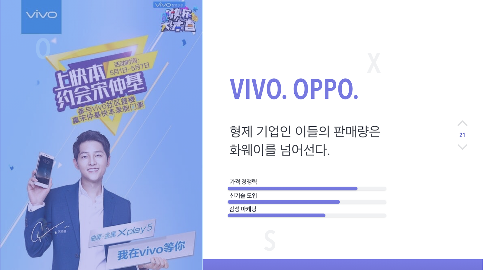 비보와 오포의 스마트폰 판매량을 더하면 화웨이를 넘어서고, 여기에 더해서 새로운 기술을 대거 도입하며 기술적으로도 뒤처지지 않으며, 송중기를 광고 모델로 내세우며 감성 전략까지 구사한 것이다.
