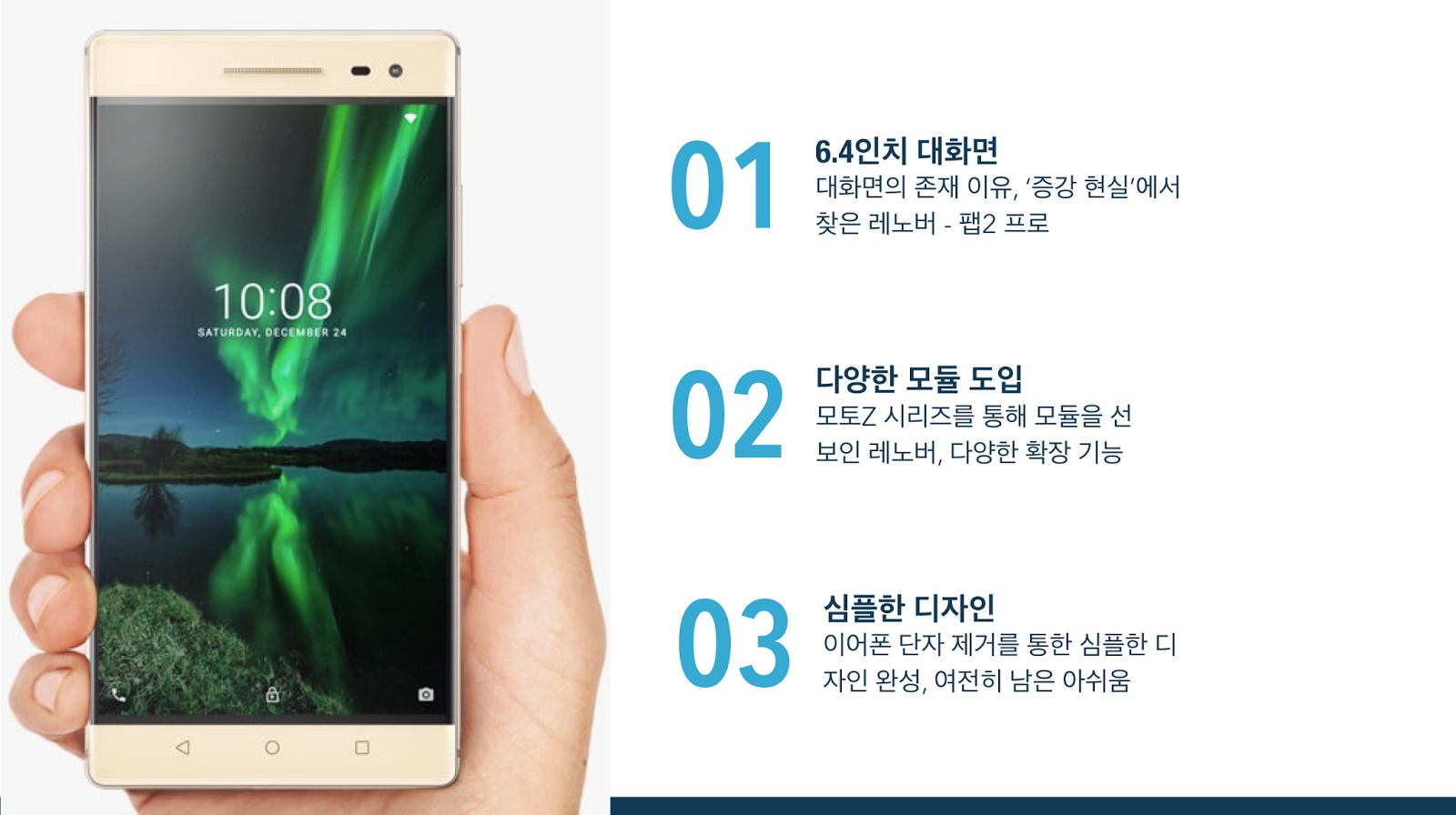 모토Z를 통해 카툭튀나 이어폰 단자도 무조건적인 단점이 되는 것만은 아니라는 것을 선보였고, 팹2 프로를 통해서는 대화면의 효과적이면서도 실용적인 목적을 제대로 선보였기 때문.