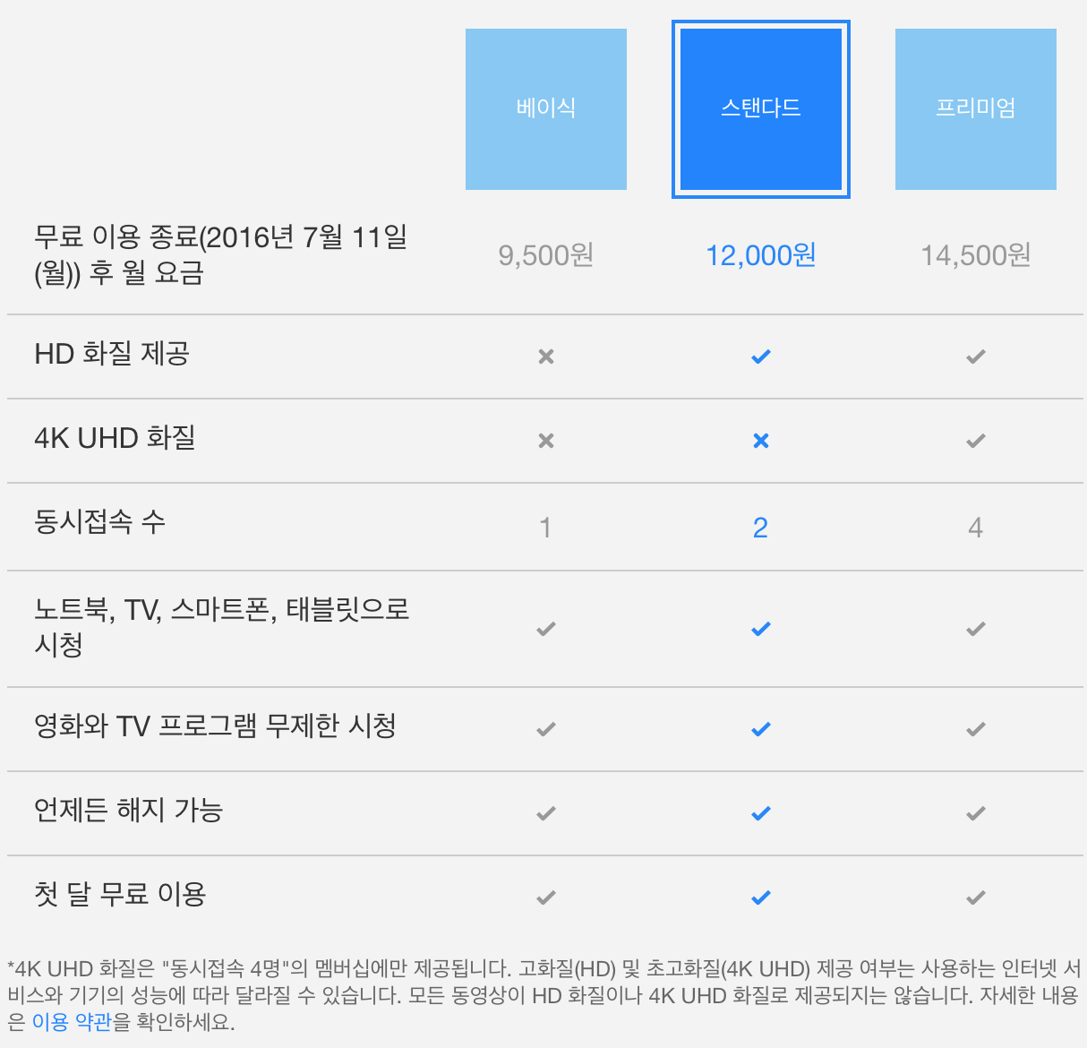 여기에 2,500원을 더한 12,000원의 스탠다드 옵션을 선택해야만 비로소 HD 화질이 제공된다. 또한 2명이 동시에 시청할 수도 있다. 그러나 여전히 4K UHD 화질은 지원되지 않는다.