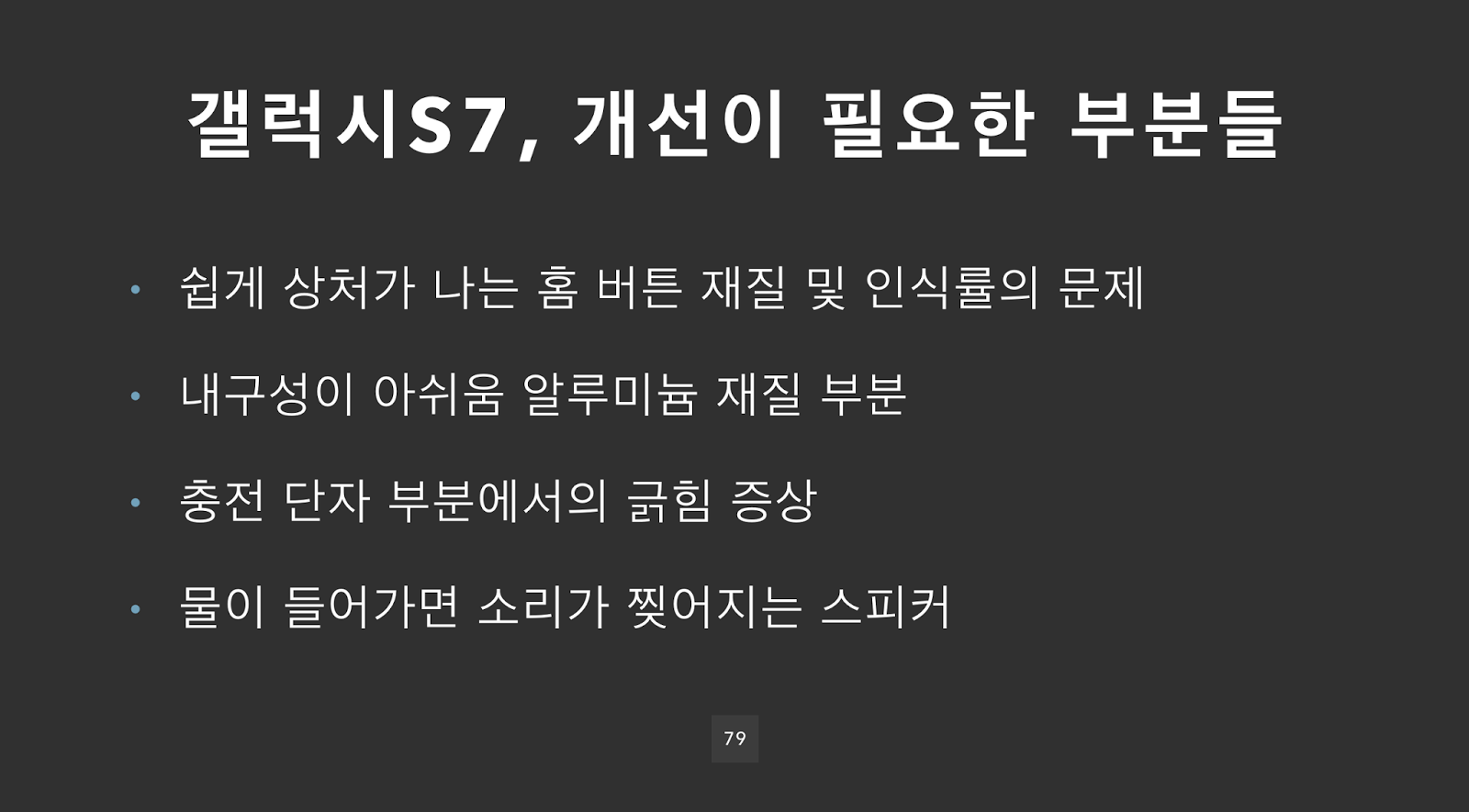 그러나 이러한 개선 사항들을 삼성 역시 모를 리는 없을 것이다. 실제로 꾸준히 지적받아 온 부분이 바로 홈 버튼의 재질 문제이고 까짐 문제였으며 지문 인식률 문제였기 때문.