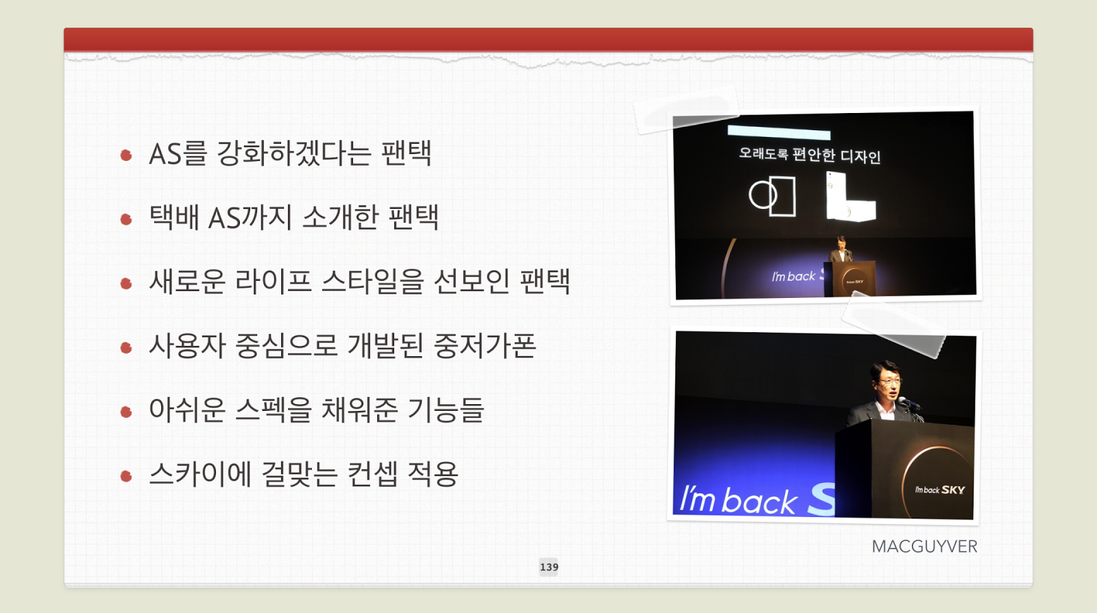 결과 ‘스카이’라는 이름을 활용하며 프리미엄 이미지를 가져왔고, 거기에 루나폰의 성공을 그대로 벤치마킹하며 적절한 스펙을 지닌 중저가폰이라는 컨셉을 잡고서 449,000원에 제품을 개발하기로 한 것이다.