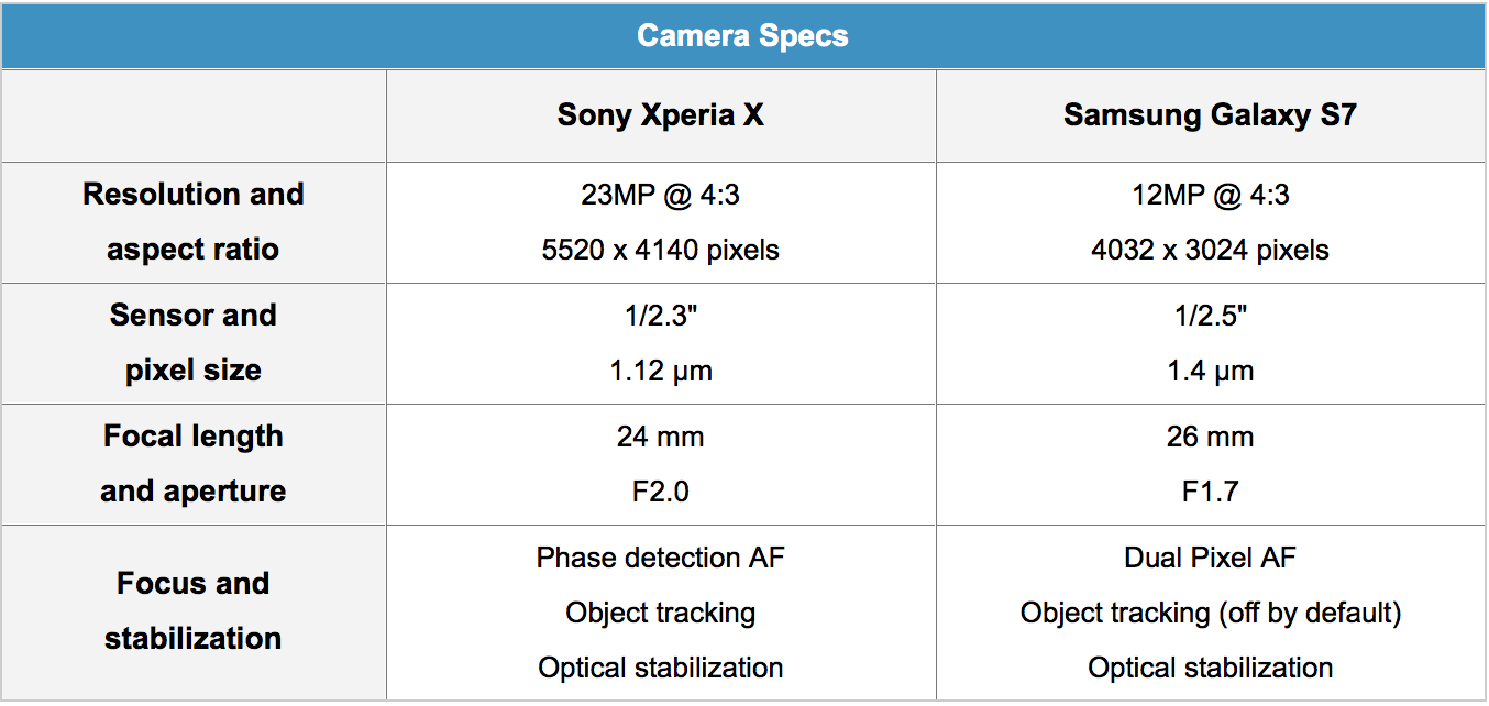 갤럭시S7에서 카메라에 집중한 삼성은 1600만에서 1200만으로 화소를 줄이는 대신, 픽셀 하나하나가 받아들이는 빛의 양을 늘려서 ‘화질’을 높이는데 집중했고, 반면에 소니는 더욱 ‘큰’ 해상도의 사진을 위해 집중한 것이다.