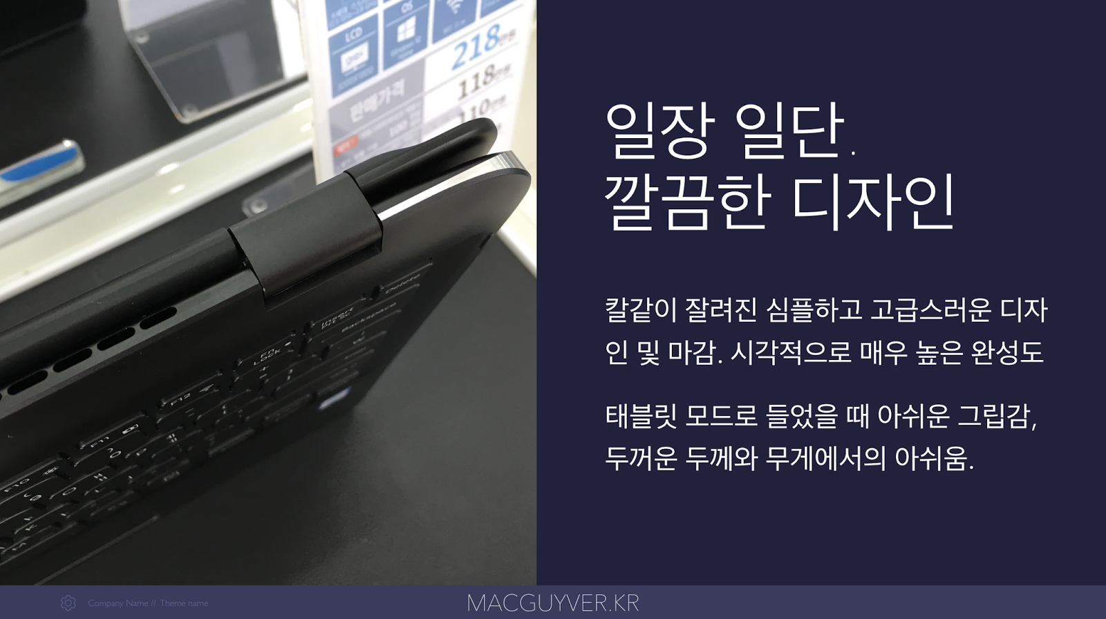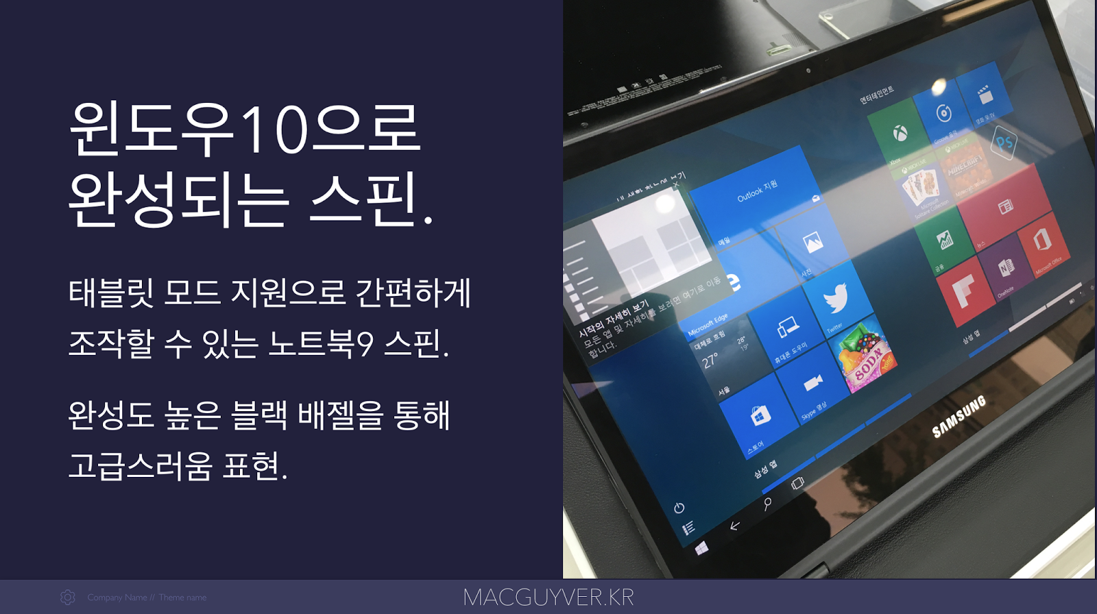 정답은 없겠지만, 이런 컨셉의 제품을 찾는다면 완성도가 높고, 특히나 700니트로 매우 밝은 화면을 지원하는 노트북9 스핀을 알아보거나, 혹은 가성비가 높은 제품으로 눈을 돌려보는 것도 좋을 것 같다. - MACGUYVER.