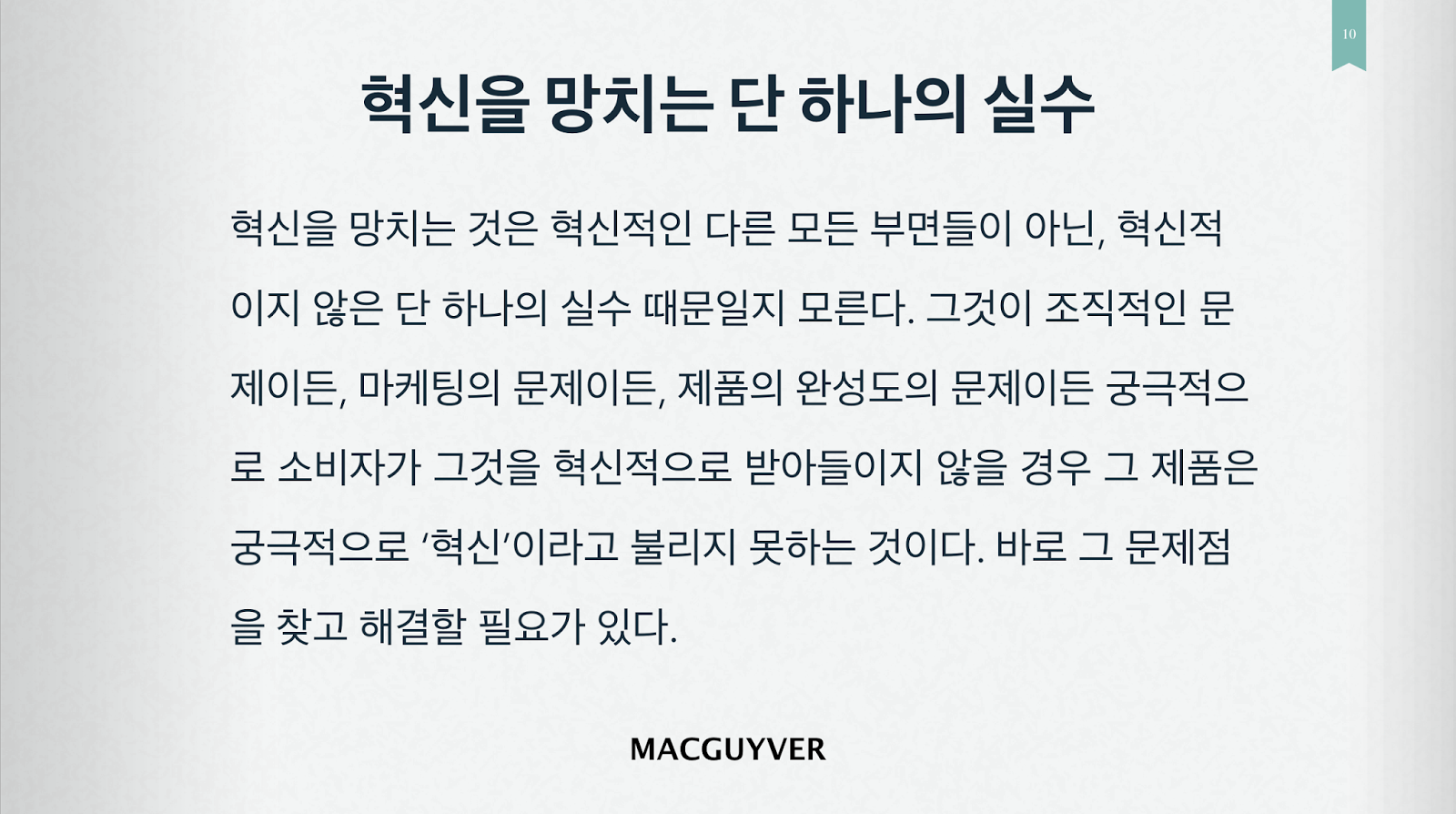 남들이 가지지 못한 하나를 줄 테니 다른 10가지를 달라고 말하는 제품에게는 누구도 관심을 가지지 않을 것이다. 제품, 기획, UX, 마케팅, 관리, AS 등등 모든 영역에 대한 혁신이 필요한 이유가 여기에 있다.