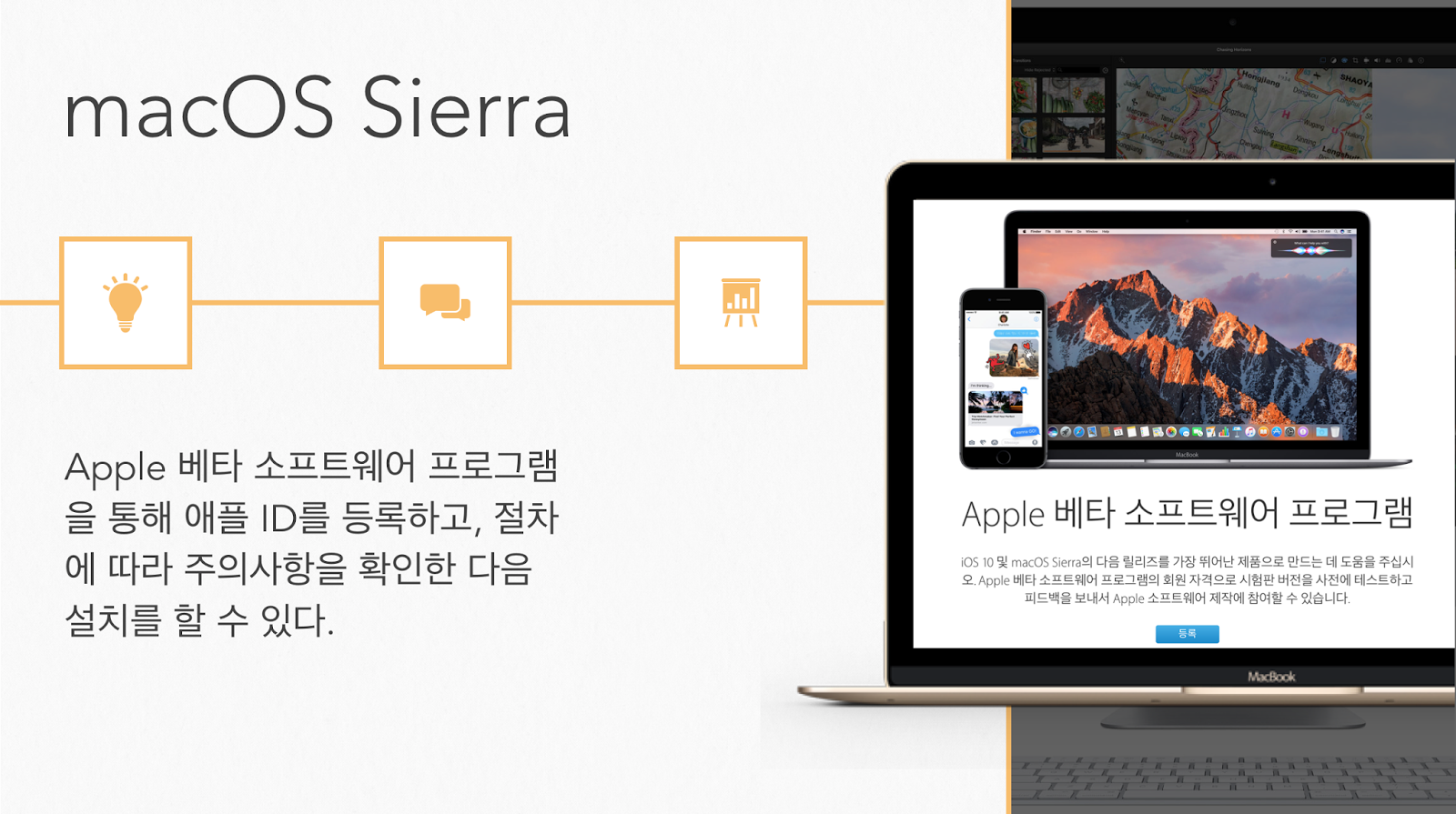 지금 바로 받을 수 있는 macOS Sierra의 첫 번째 퍼블릭 베타 버전은 이러한 모든 기능을 바로 지금 사용 중인 맥에서 체험해볼 수 있다는 점에서 매력적인 제안이다.