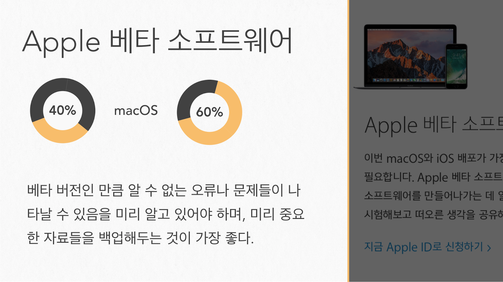 완성도를 상당히 끌어올렸다 하더라도 베타는 어디까지나 베타이기 때문. 그래서 미리 현재 맥의 자료를 백업해두거나 아니면 완전히 초기화한 다음에 설치하는 것이 좋다.