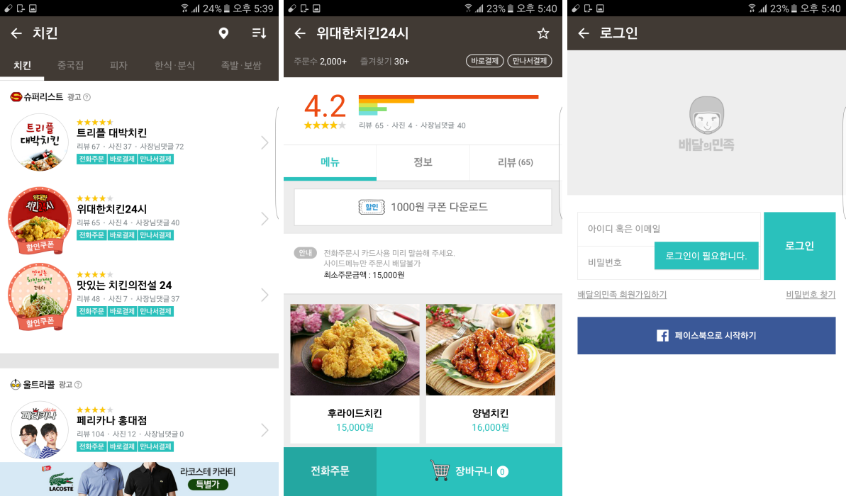 할인 쿠폰을 다운받아서 바로 활용할 수 있는 배달의 민족, 로그인을 하게 되면 더욱 개인화된 정보를 얻을 수 있다 ▼
