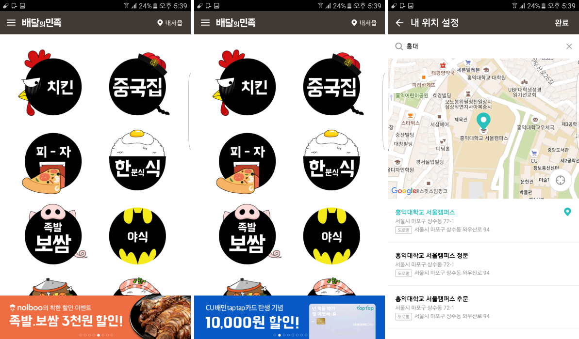 다양한 할인 정보와 함께 음식의 종류별 구분이 빠른 주문을 가능하게 해줬다. 위치 기반으로 현재 위치뿐만 아니라 원하는 위치도 설정이 가능하다 ▼
