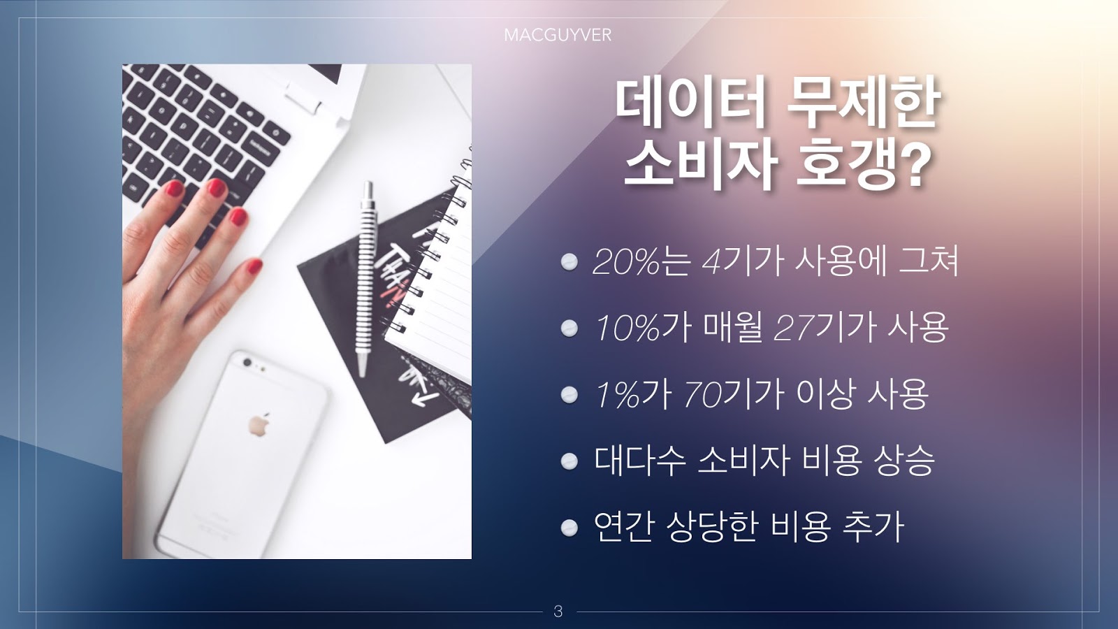 이러한 사용량이라면 요금제를 한 단계 낮춰서 요금을 절약할 수도 있고, 심지어 데이터 무제한과 관련이 없는 알뜰폰을 선택하는 것이 더욱 합리적인 분들도 많이 있다. 하지만 문제는 절대다수의 소비자들이 이것을 모른다는 것이다.