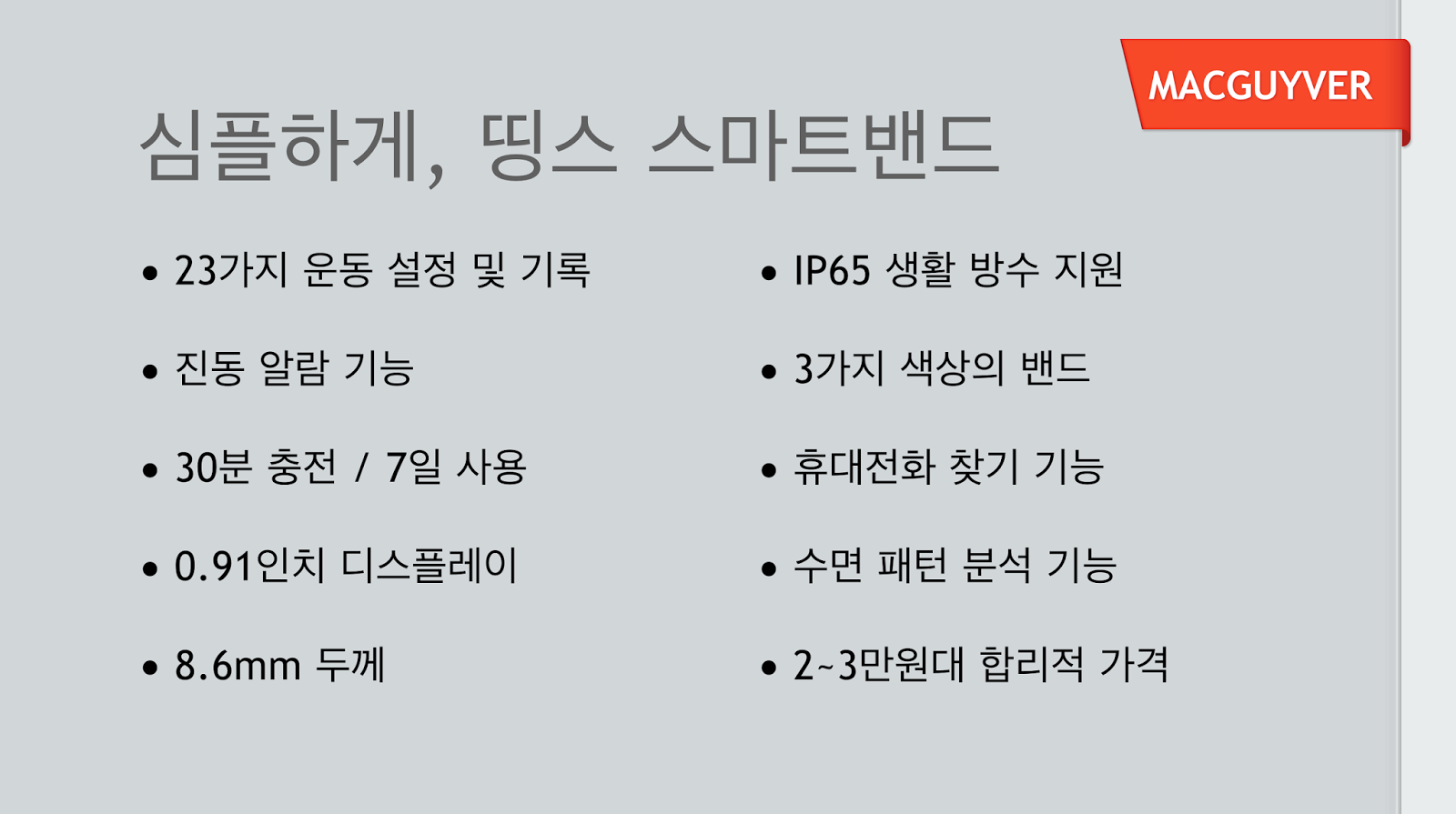 2~3만원대 스마트밴드를 찾는다면, 또한 국내에서도 믿고 구입할 수 있는 제품을 찾고 있었다면, 띵스 스마트밴드를 알아보는 것도 좋을 것 같았다. 부담 없이 구입해서 24시간의 일상을 모두 담아주기 때문이다. - MACGUYVER.