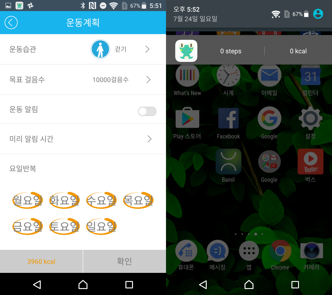 운동의 경우도 앱을 통해 보다 정밀하게 설정할 수 있었는데, 건강유지 혹은 체중감소 가운데 선택할 수 있는 점은 간편하면서도 꼭 필요한 두 가지 선택지였다 ▼