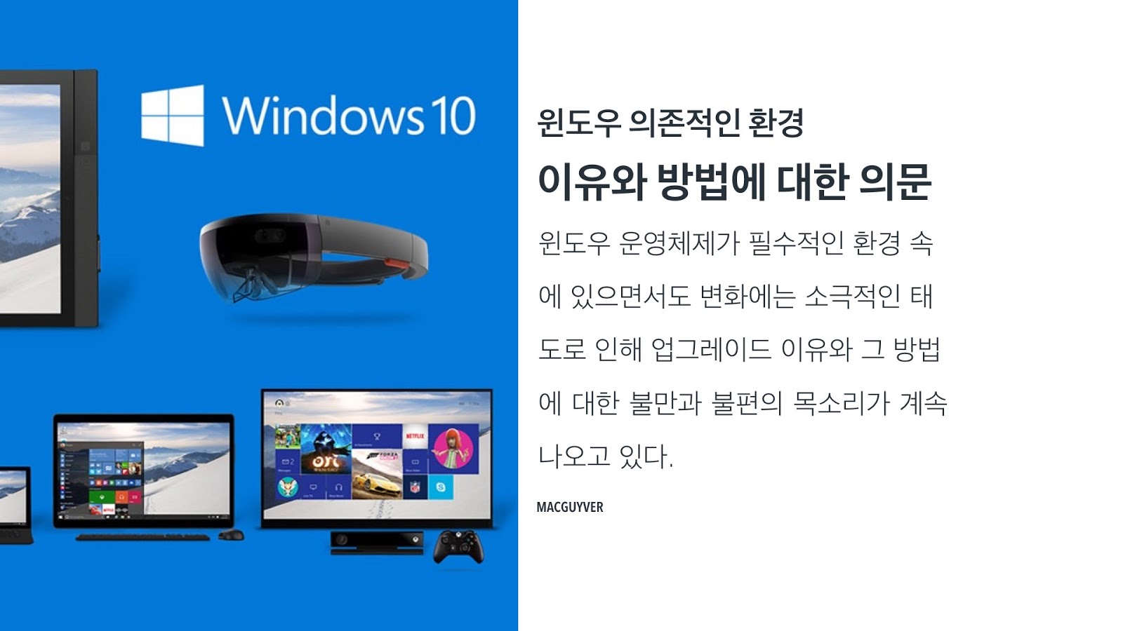 전 세계적으로 윈도우 운영체제의 비중이 줄어드는 가운데, 모바일 Only 세대가 늘어나고 있음에도 여전히 업무 환경이나 다양한 공공 기관에서 사용되는 PC 환경은 윈도우에 종속된 모습을 보여주고 있다.