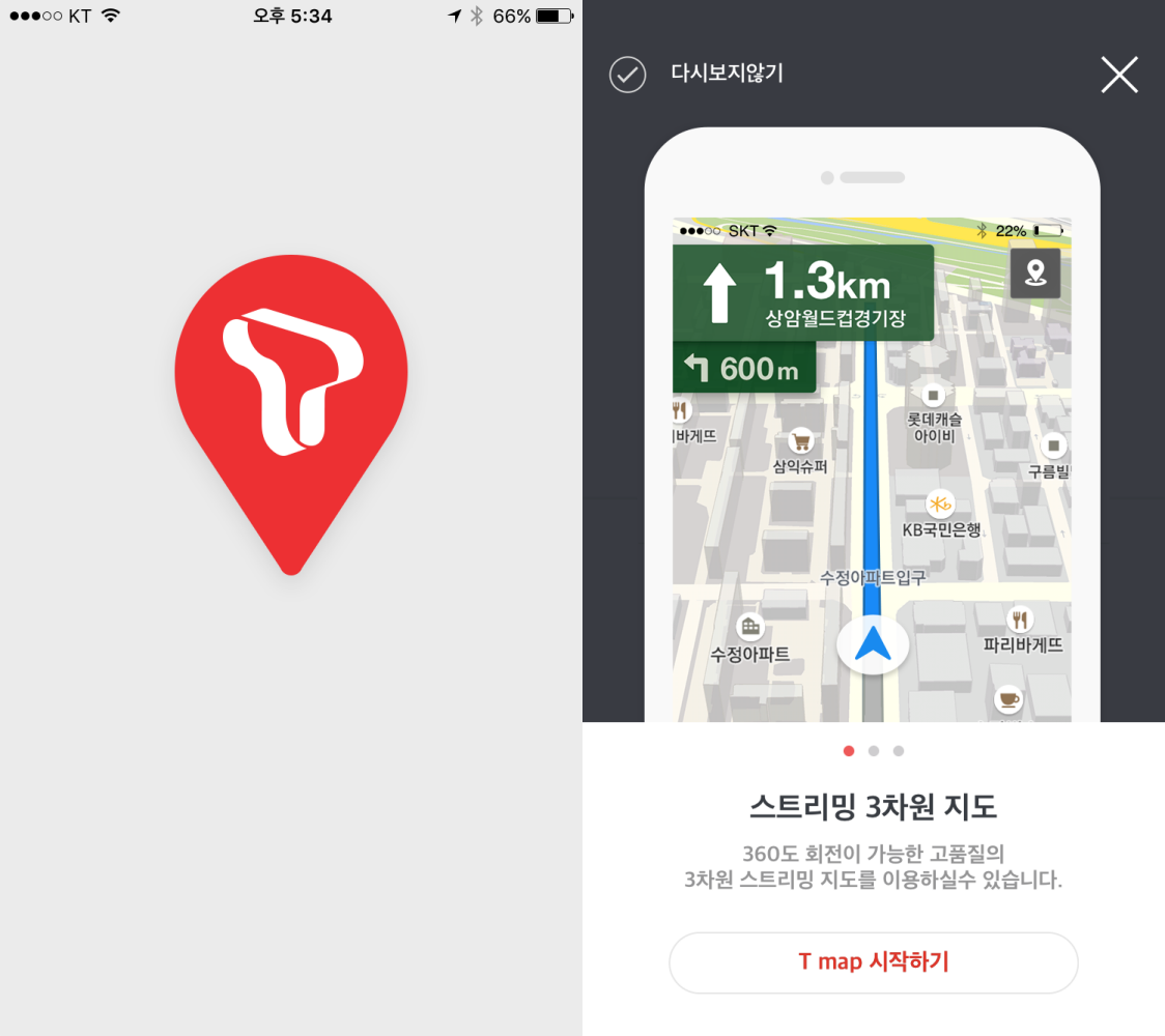 T맵 특유의 로고에 더해, 스트리밍 3차원 지도까지 지원했다 ▼