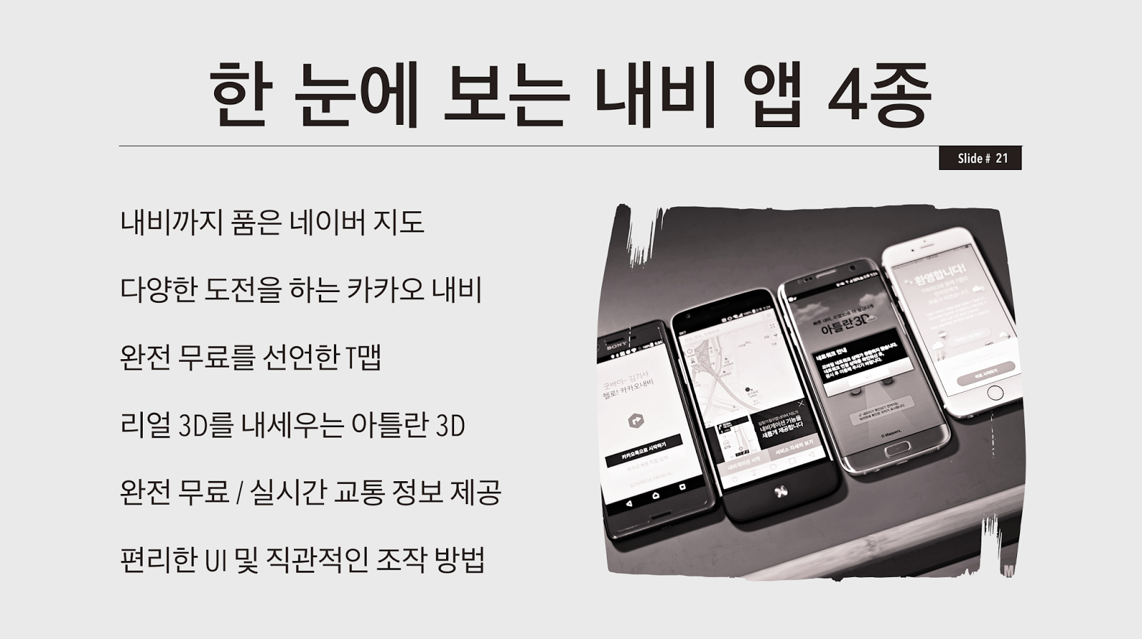 말 그대로 서비스 전쟁이 시작된 것인데, 아마도 2년 정도가 지나면 시장은 차츰 정리가 될 것으로 보인다. 어쩌면 네이버 지도나 카카오 지도는 이름만 유지되는 포털의 기본 서비스로 편승할지 모르며, 아틀란이나 T맵 등 메이저 내비 앱이 여전히 전쟁 중에 있을 것으로 보인다.