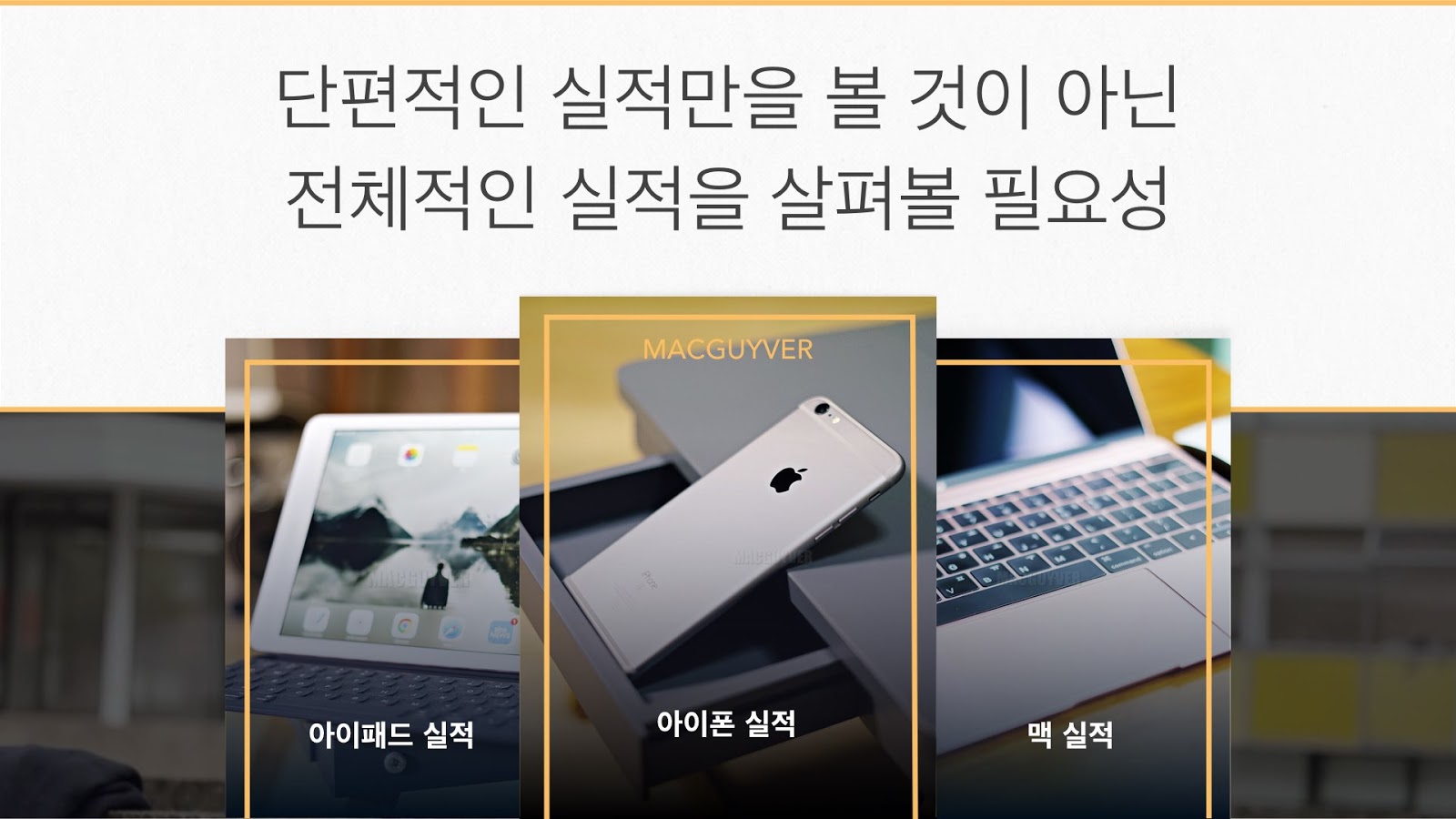 여기서 가장 관심이 가는 대목은 과연 아이폰의 판매량이 나날이 꺾이느냐 하는 것이다. 하지만 언론에서는 당장 지난해 같은 분기와 바로 앞의 분기 기준으로만 아이폰의 판매량을 평가하며 깎아내리기에 바쁘다.