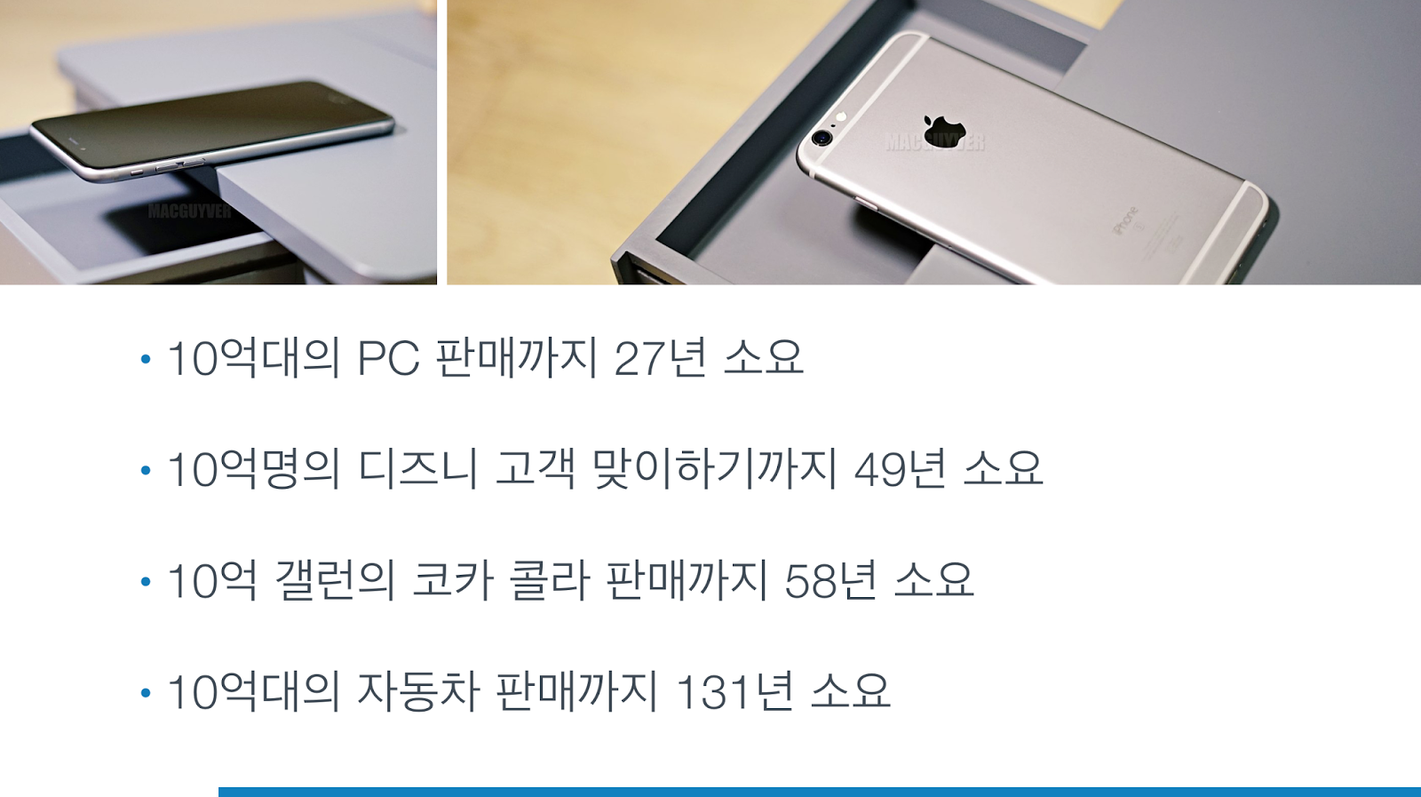 이를테면, 개인용 컴퓨터인 PC가 10억대 판매를 돌파하기까지는 무려 27년이 걸렸고, 세계에서 가장 유명한 디즈니 놀이공원의 경우도 10억 번째 고객을 맞이하기까지 소요된 시간이 무려 49년이라고 한다.
