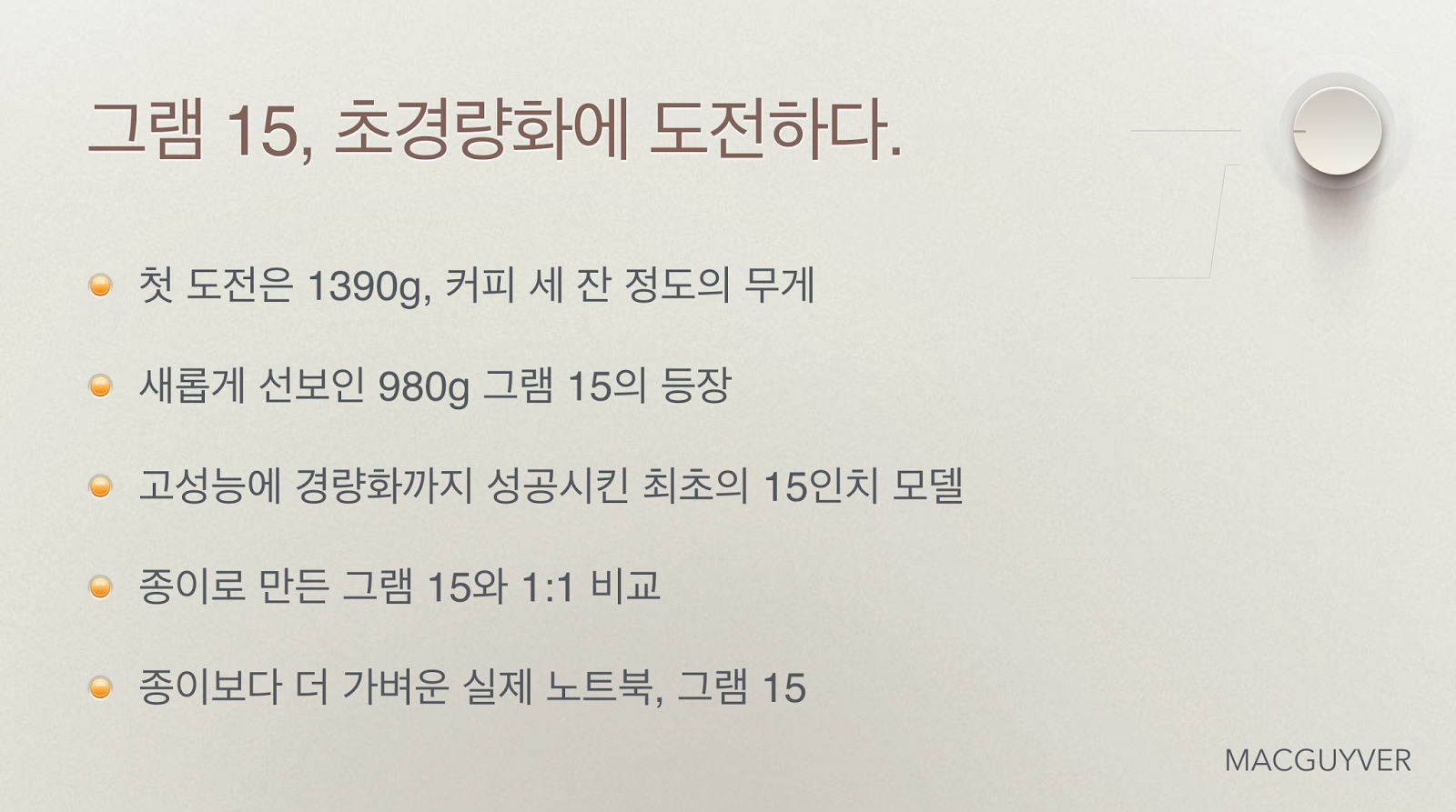 이제는 기네스북 등재를 통해 전 세계적으로도 이름을 떨치게 된 그램 시리즈. 차기 그램 시리즈가 더욱 기대되는 이유는 이러한 확실한 콘셉트와 방향성을 제대로 드러내주기 때문이 아닐까 싶었다. - MACGUYVER.