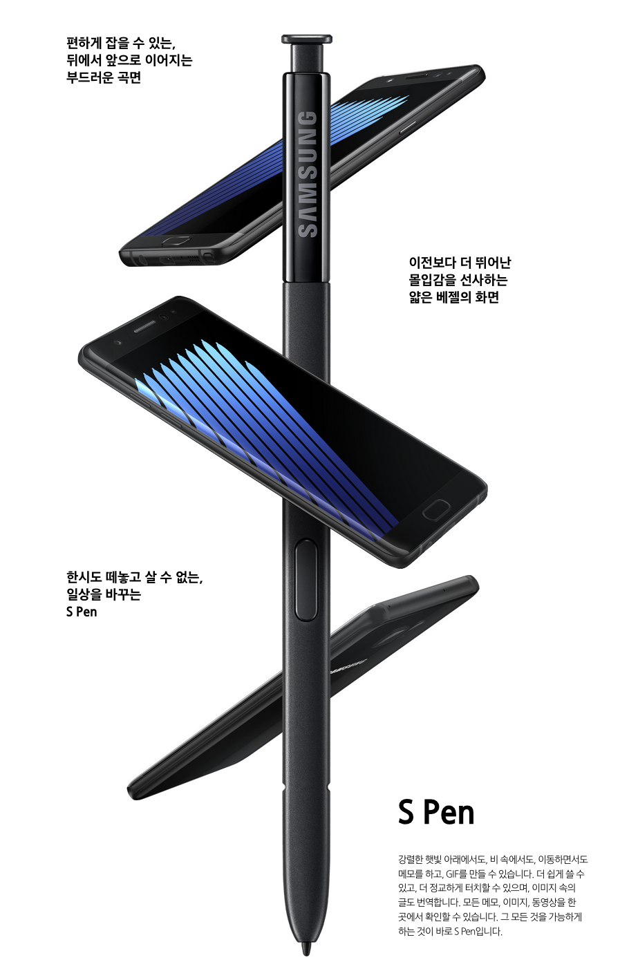 갤럭시S7 엣지의 경우 물속에서는 사실상 터치를 포기해야 하지만, 갤럭시노트7은 S펜을 활용해서 얼마든지 조작을 할 수 있기 때문에 비가 오거나 물이 닿아도 마음 놓고 폰을 사용할 수 있다는 점에서 새로운 편의성을 더했다고 볼 수 있다.