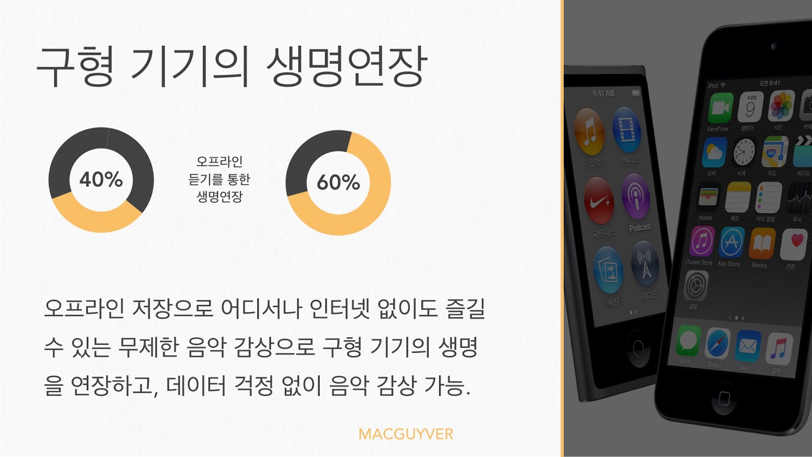 이 말은 잠자던 기기에 생명을 불어넣을 수 있음을 의미한다. 사용하지 않던 아이폰이나 아이패드를 애플 뮤직 전용 음감 기기로 만들 수도 있는 것이다. 또한 데이터 소모량을 줄일 수 있기 때문에 어디서나 마음 놓고 즐기는 것도 가능하다.