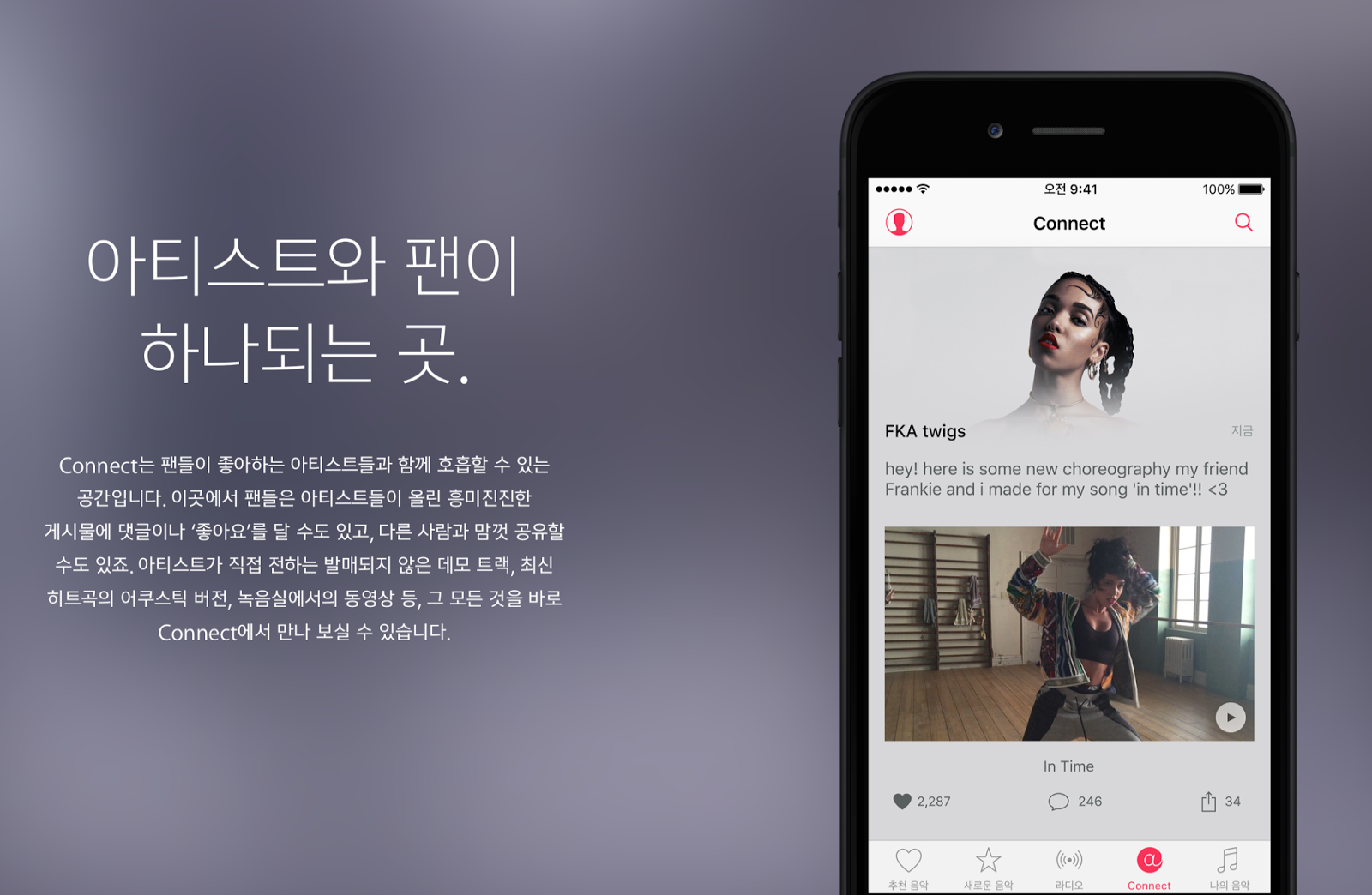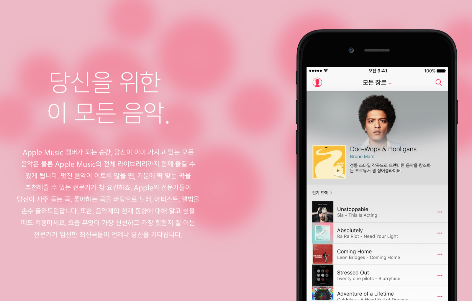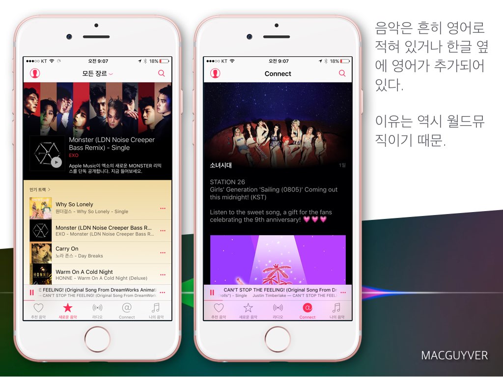 사실, 처음에는 한국 음악이 많이 없었다. 국내에 정식 진출을 하지 않아서 국내 음원사 및 가수들이 직접 애플 뮤직에 등록을 거쳐야 했는데, 이제는 국내 진출을 하면서 심지어 국내 음원사보다도 먼저 독점 음악을 공개하는 경우도 있다고.