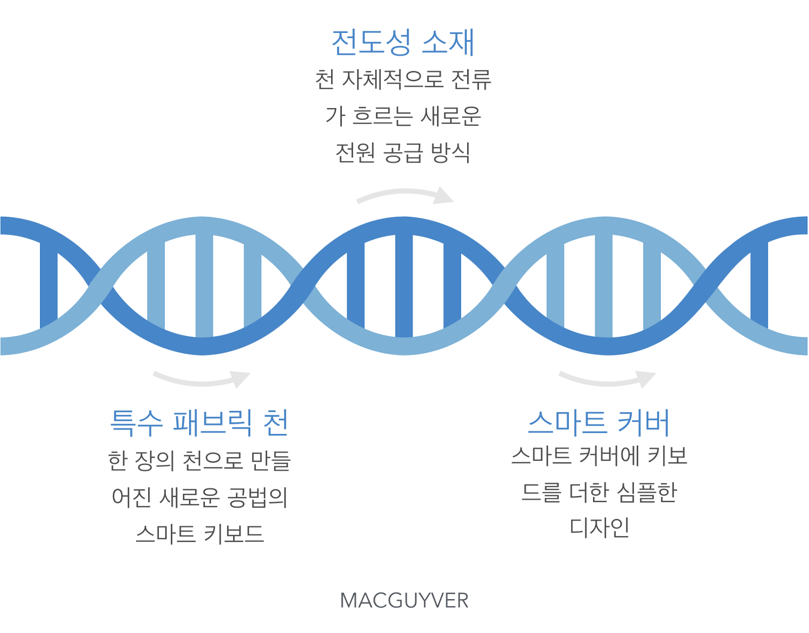 앞으로도 뒤로도 완전히 접혀지는 스마트 키보드의 구조상 기존의 방식으로는 내구성이 담보되지 않았던 것이다. 그래서 스마트 키보드는 천 자체에 전류를 공급하기로 했고 오랜 시간의 연구 개발 끝에 꼭 적절한 만큼의 전류가 흐르는 소재를 만들어낸 것이다.