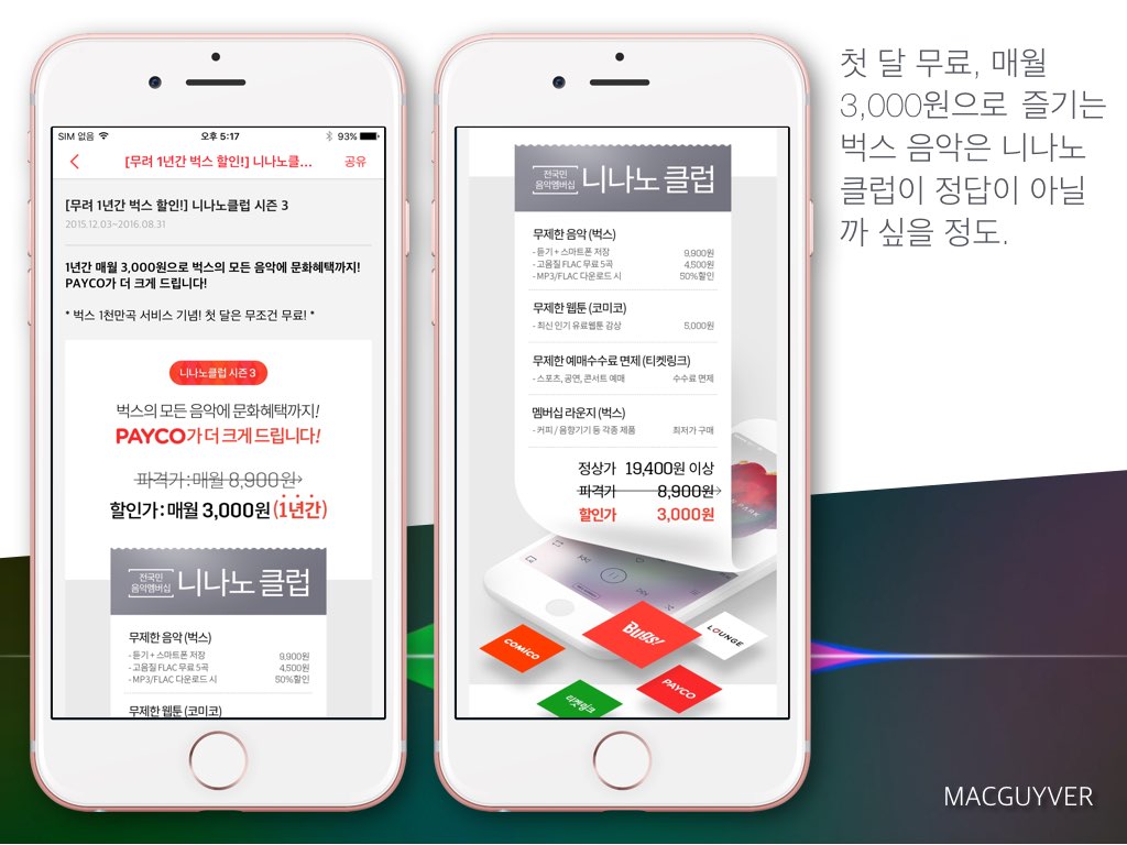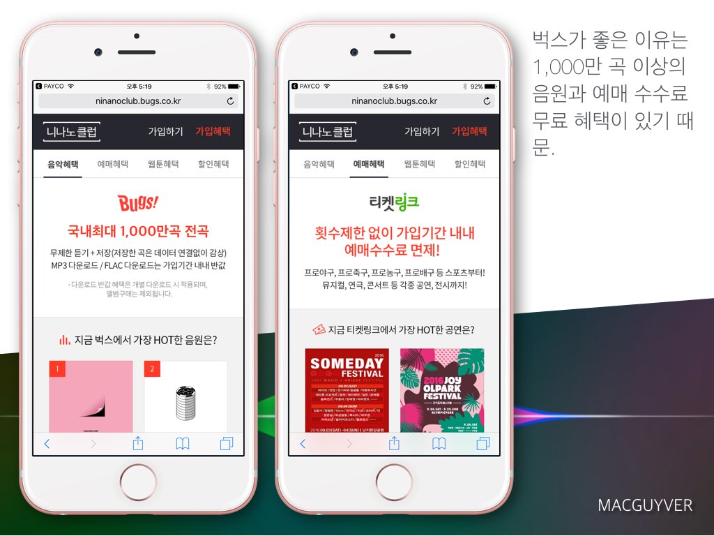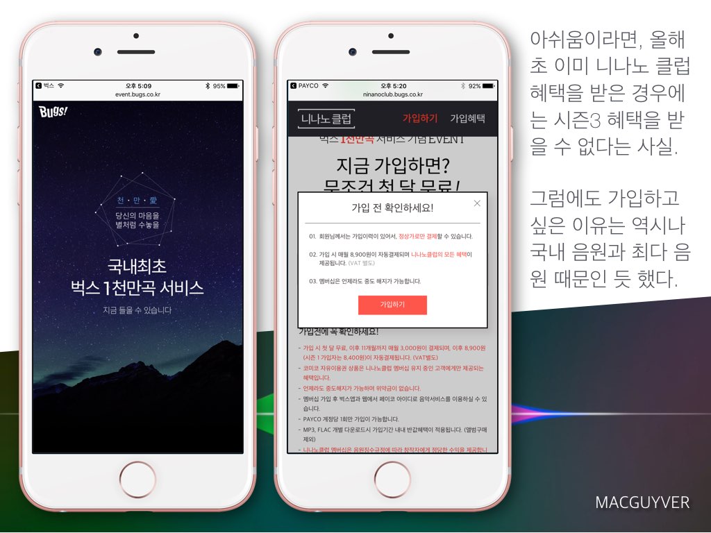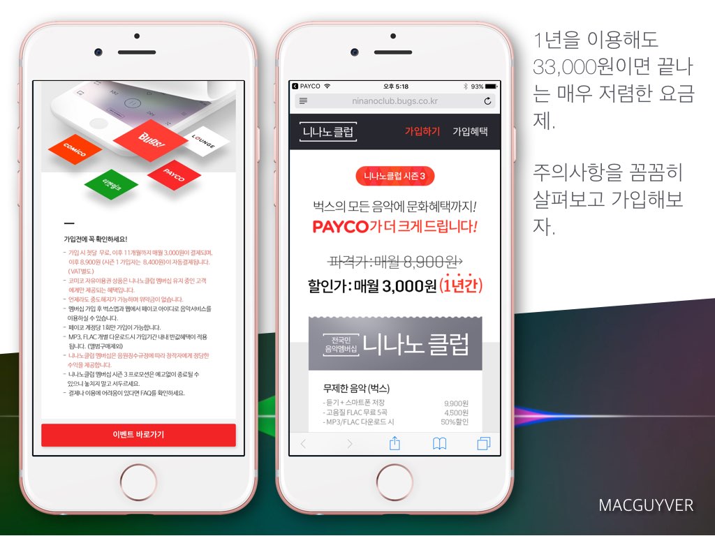 이어지는 포스트를 통해서 벅스 니나노 클럽을 이용할 수 없는 경우, 다른 음원 서비스를 더욱 저렴하게 이용할 수 있는 방법을 살펴볼 예정이다. 통신사를 통한 무제한 데이터까지 즐길 수 있는 방법을 원한다면 이어지는 포스트를 기다려보자. - MACGUYVER.