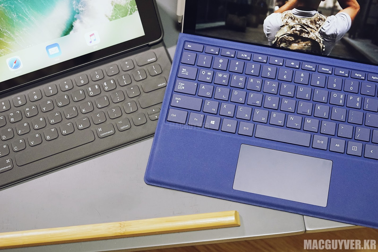 그래서 이 둘을 1:1로 놓고 보자면 서피스 프로4의 타입 커버는 다소 크고 넓은 느낌이 들었고, 반면에 아이패드 프로의 스마트 키보드는 매우 심플하고 군더더기 없는 느낌을 전달하고 있다.