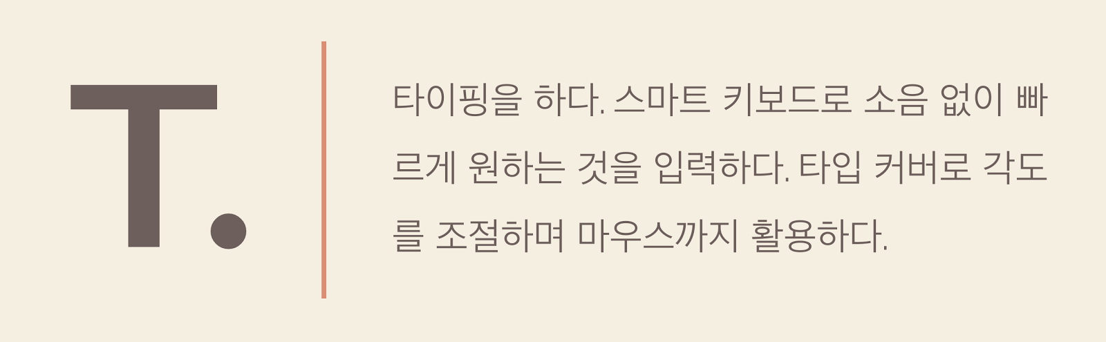 반면 타입 커버는 소음이 다소 느껴졌는데, 소음이라면 소음이겠지만 경쾌한 타격음이라고 할 정도로, 저렴한 키보드에서와 같은 플라스틱이 부딪히는 소리가 아닌 타이핑을 한다는 정도의 소리가 잔잔하게 들렸다.
