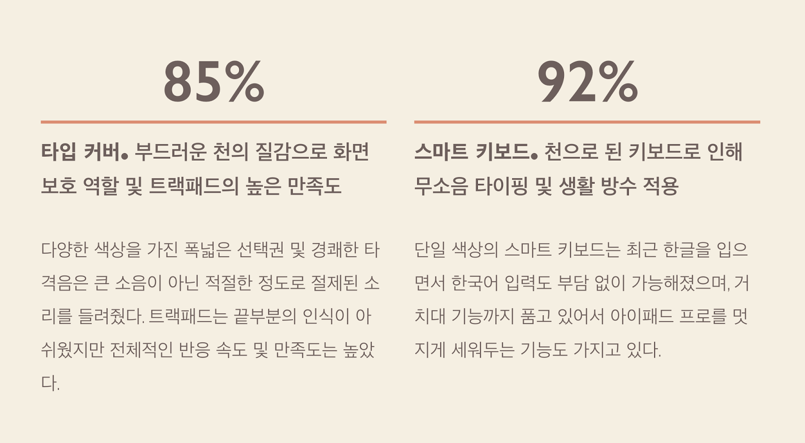 동시에 키감도 유지해야 한다는 점에서 적당한 정도의 두께감도 있어야 하는데, 다양한 상황에서 제대로 활용하기 위해 키보드는 더욱 가벼워지고 튼튼해질 필요가 있어 보였다.