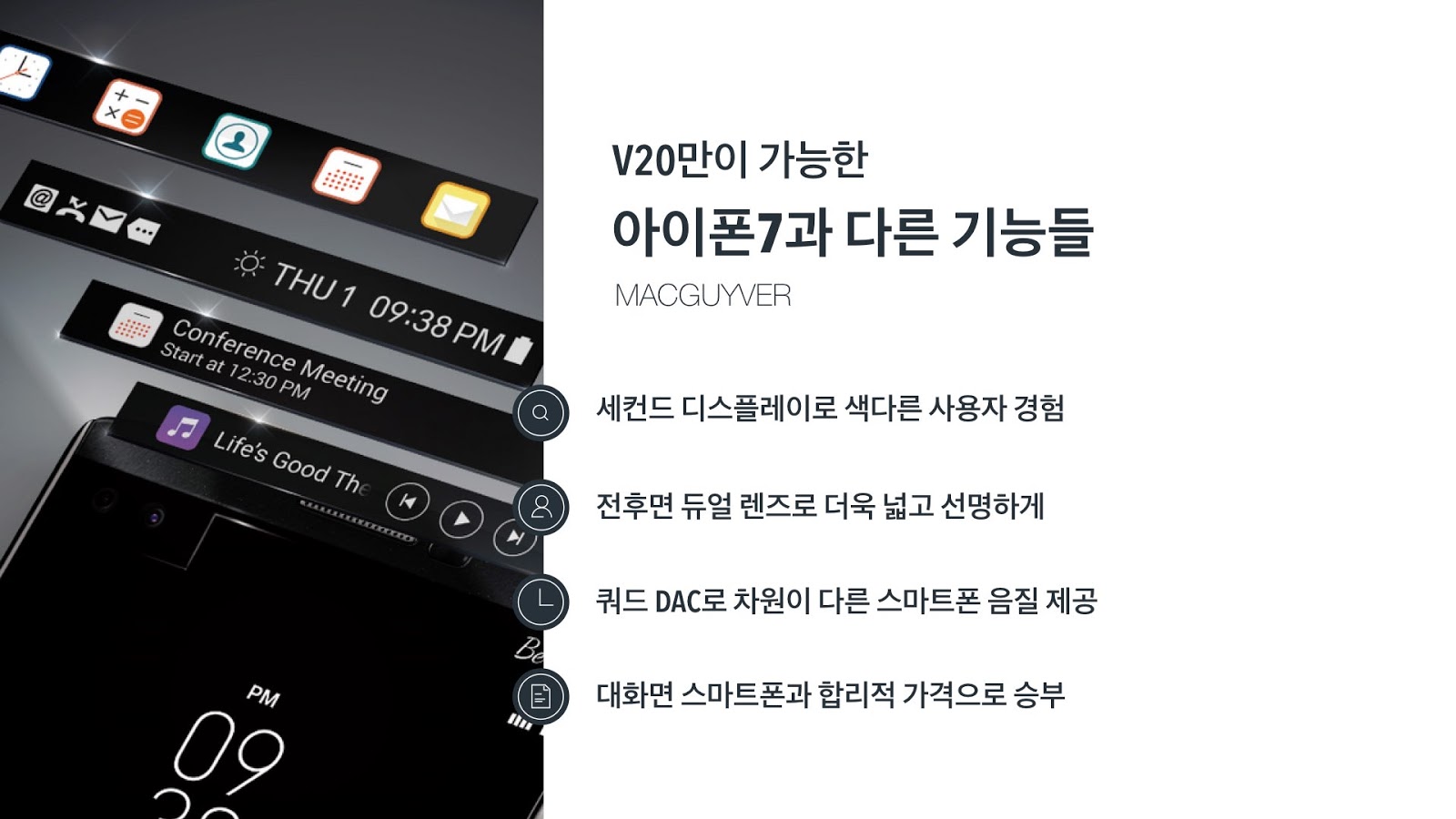 즉, 엘지는 특화 시장을 노리는 것이다. 아이폰이 모든 대중에게 사랑받는 하나의 스마트폰이라면, 틈새시장을 노리듯 엘지는 V20만이 할 수 있는 것에 집중하기로 했고 그래서 ‘듣다. 보다. 그 이상’이라는 문구를 통해 차별화를 선보이려는 것이다.