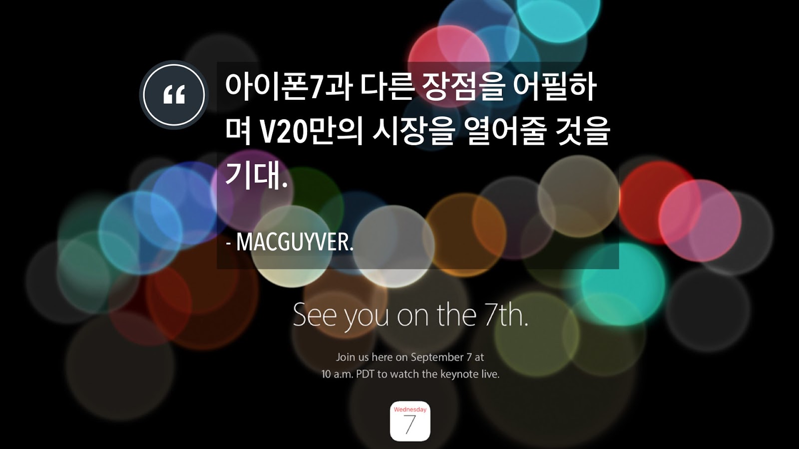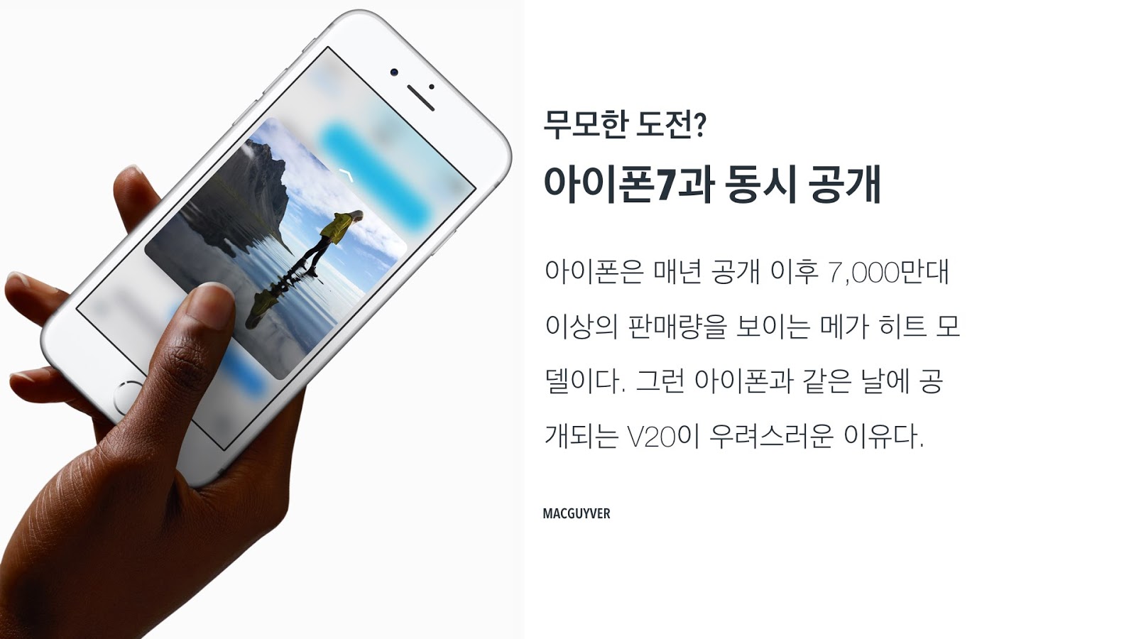 적어도 아이폰7과 함께 공개된 것만으로 많은 언론에서는 아이폰7과 V20을 비교하는 뉴스와 포스트들을 통해 대중적으로 홍보 효과는 제대로 얻을 것으로 보이기 때문. 그러나 칠전팔기도 확실한 전략이 필요하다.