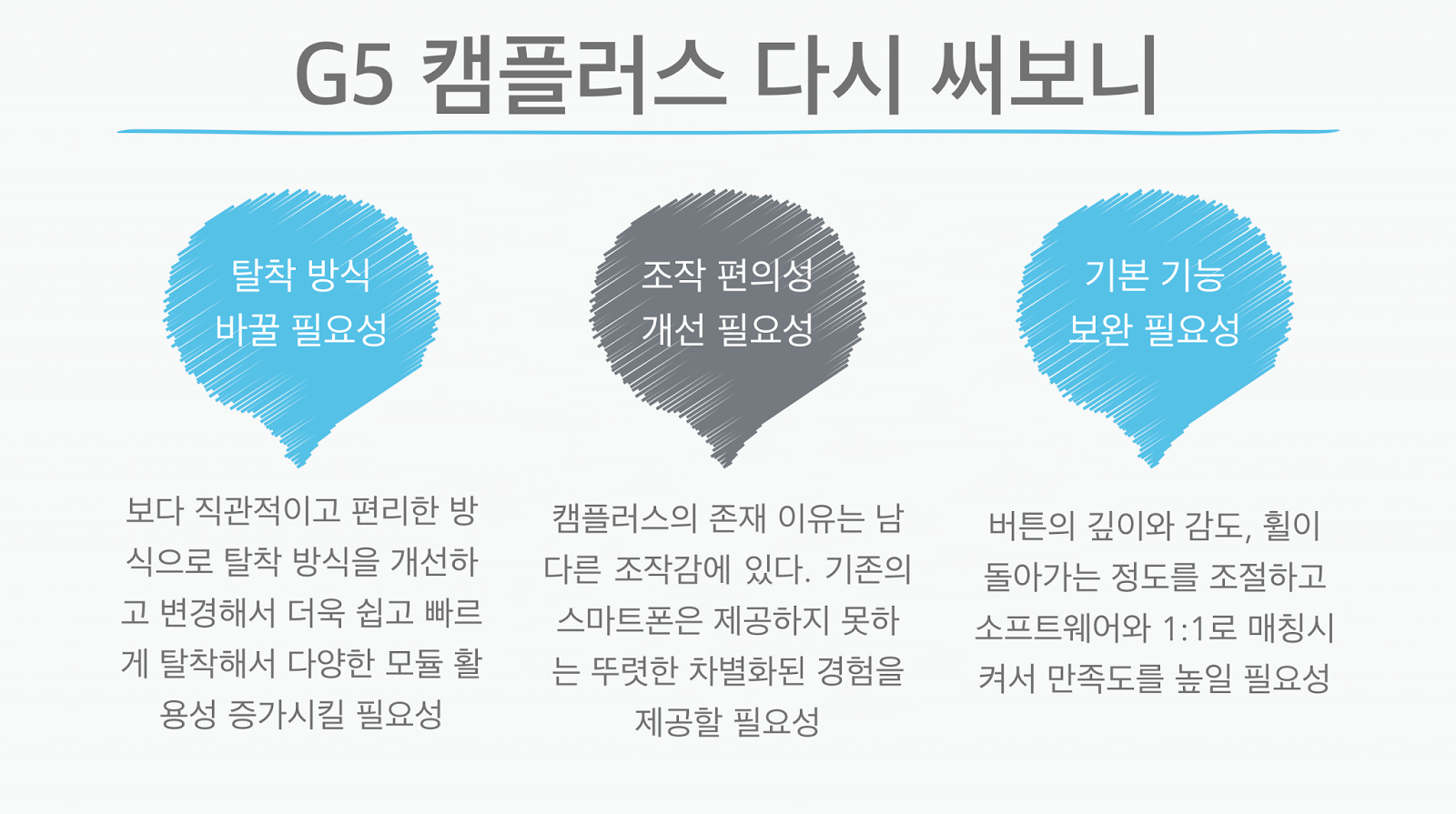 마지막으로, G5 캠플러스는 언제나 G5에 전력을 공급하는 보조배터리가 되었으면 한다. 현재와 같이 사진 촬영 시에만 G5에 전력을 공급하는 아이디어는 너무나도 난해하고 사용자로서 불편함이 많았다.