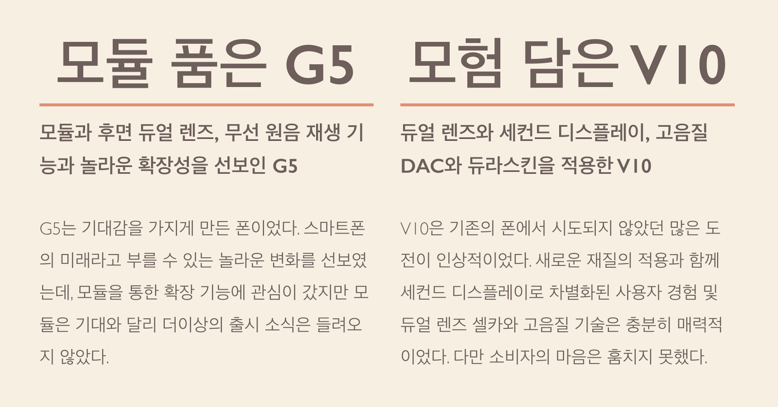 이 둘은 한 마디로 말해서 완전체인 하나의 폰과 기본기가 충실한 모듈형 폰이라고 부를 수 있을 것 같았다. V10은 하나로 끝나는 반면, G5는 언제라도 다른 얼굴을 가질 수 있는 모듈을 채택했기 때문이다.