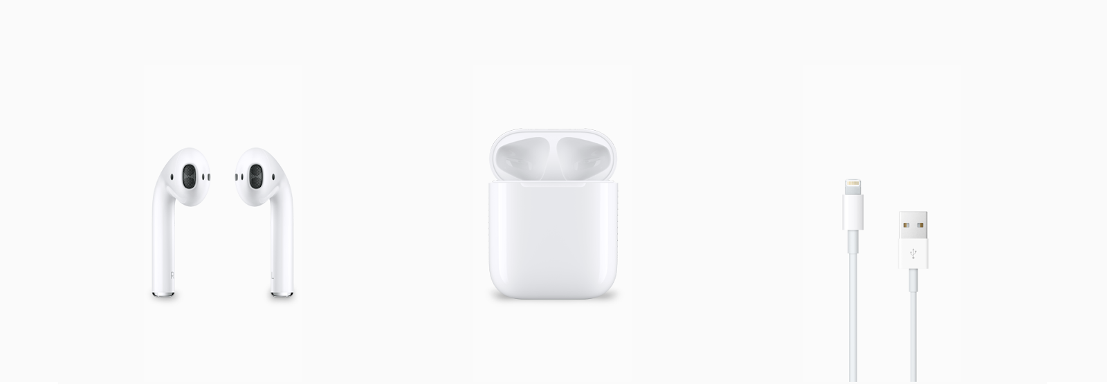에어팟을 구입하게 되면 기본적으로 좌우 한 쌍으로 이루어진 에어팟 본체와 함께 급속 충전이 가능한 충전 케이스가 제공되며, 라이트닝 케이블 역시 기본적으로 포함되어 있다.