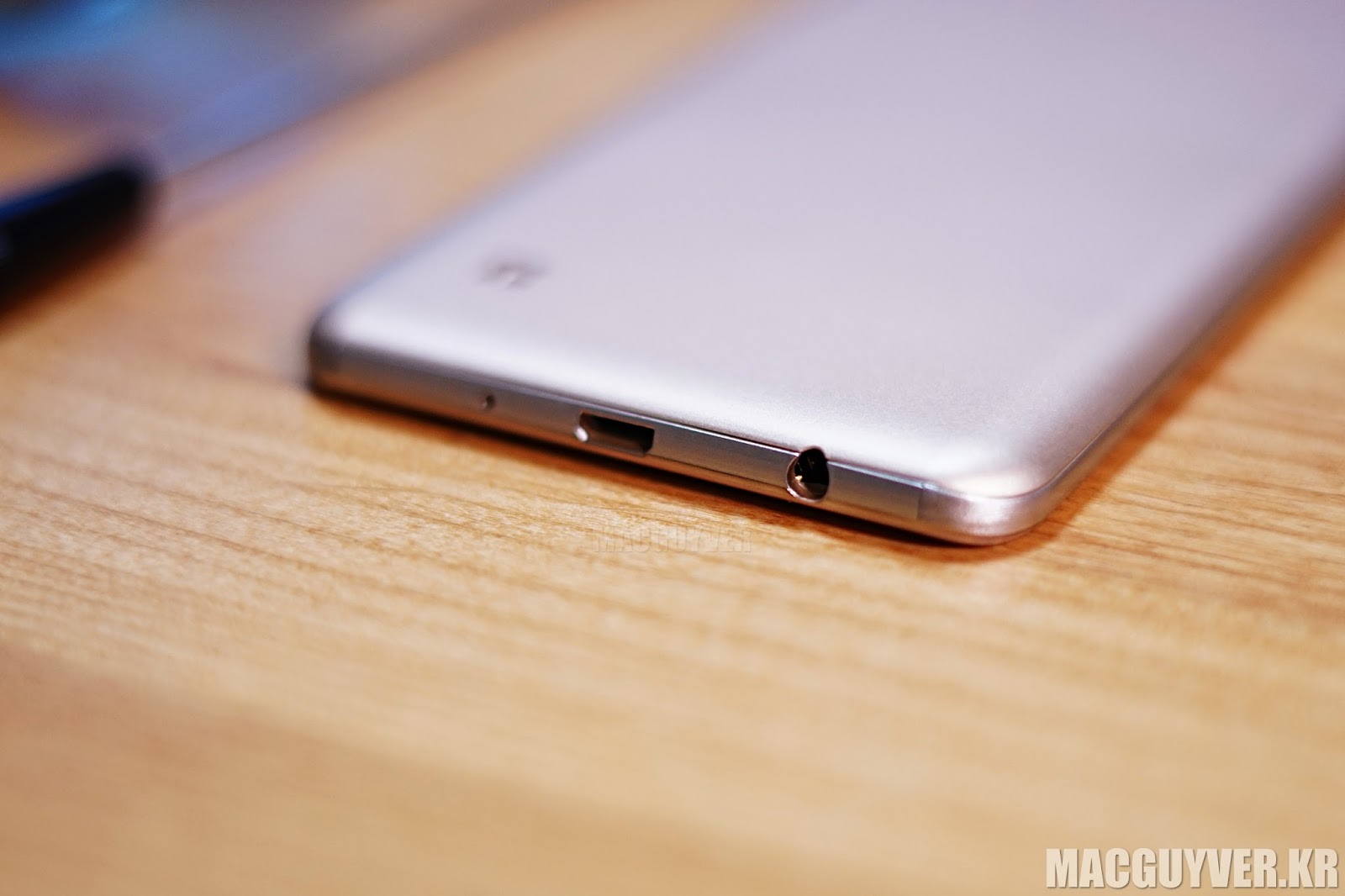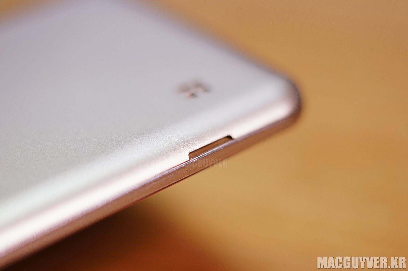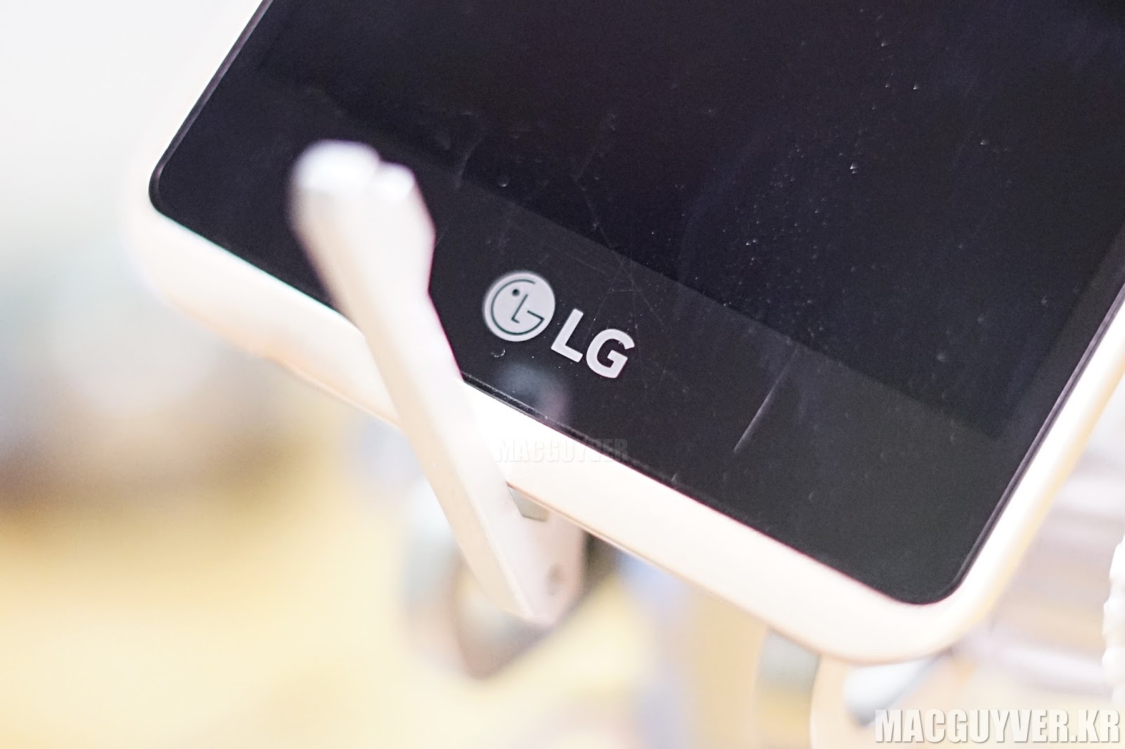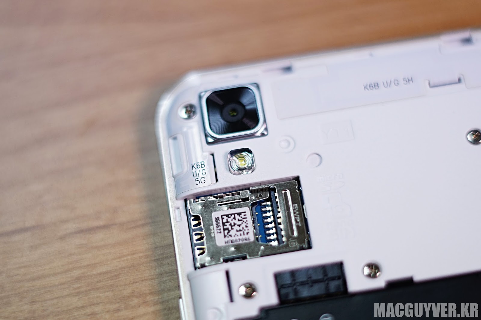 카메라는 왼쪽 귀퉁이에 다소곳이 자리를 잡고 있었고, 그 아래로 시선을 내려보면 스피커 구멍이 있었다. 왜 여기에 스피커가 있어야 하는지는 모르겠지만, 엘지는 후면 하단에 스피커 홀을 내놓아서 폰을 세워놓고 음악을 듣거나 동영상을 보라고 권유하는 듯했다.