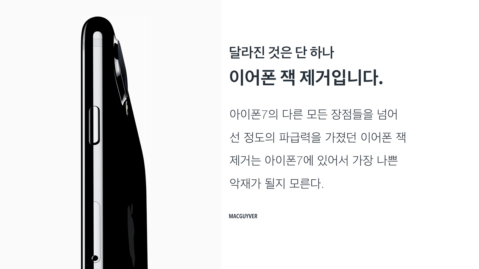 마치 과거에 아이폰이 처음 등장했을 때의 30핀 충전 잭, 그리고 그다음으로 라이트닝 충전 잭이 없어서 충전을 못하던 상황이 연출되는 것만 같은 이어폰 잭 제거는 또 다른 아이폰의 불편함으로 각인될지 모른다.