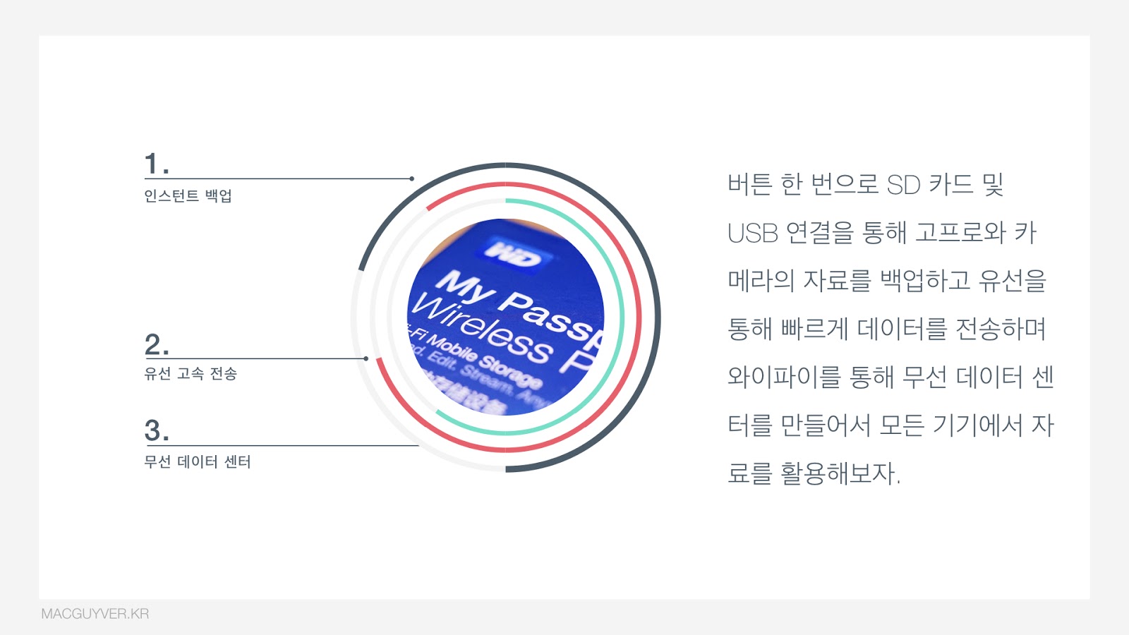 고프로를 통해 어디서나 마음 놓고 촬영하고, 수많은 기기에 나눠진 데이터들을 한데 모아서 백업하고 자동 백업으로 언제나 최신 상태를 유지하면서 10시간 배터리 타임으로 오프로드까지 자유롭게 데이터를 활용할 수 있는 WD My Passport Wireless Pro를 알아볼 것을 추천하는 이유다. - MACGUYVER.