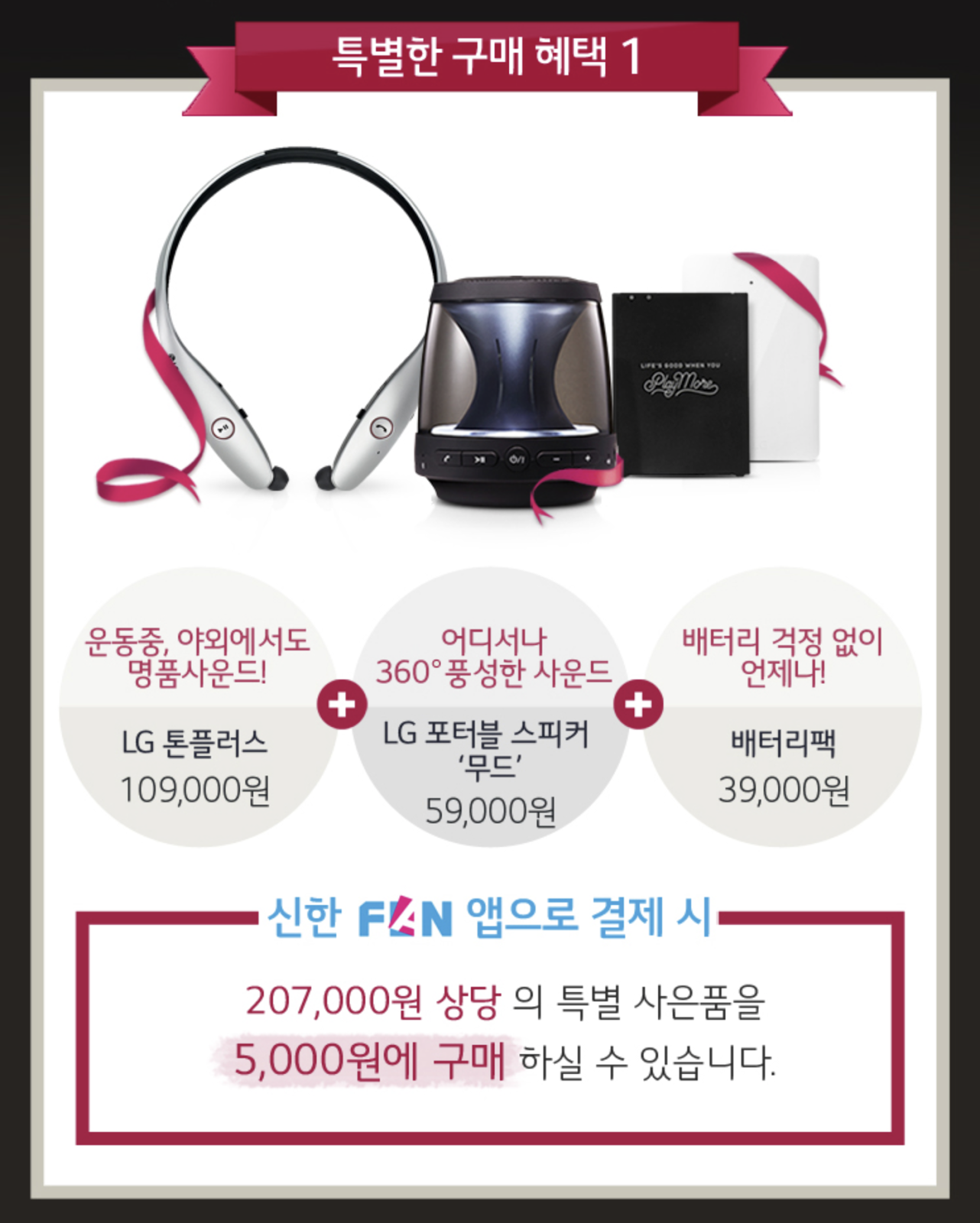 우선, 국내 블루투스 이어폰 시장에서 만년 1위를 차지하고 있는 톤플러스와 함께 포터블 스피커 ‘무드’ 그리고 배터리 걱정이 필요치 않은 배터리팩까지 한 번에 받을 수 있다. 이 혜택만 207,000원이라고 하니 이것을 5,000원에 구입할 수 있는 알짜 혜택에 가장 관심이 간다.