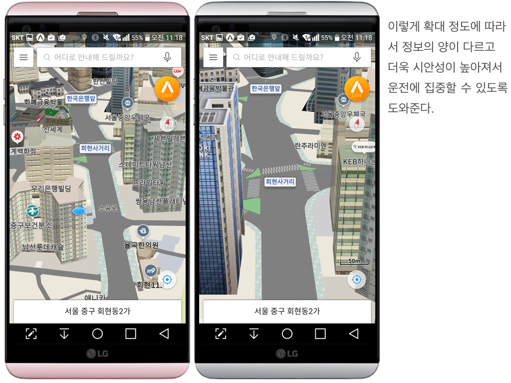 일반적인 2D 화면의 경우는 입체감이 없어서 길을 찾기에 어려움이 있었고, 3D 화면의 경우는 빠른 속도에서 시인성이 낮은 한계가 있었는데, 이러한 아쉬움을 해결하기 위해 고민한 흔적이 돋보이는 오토줌 기능이 이번에 더해졌다고 한다.