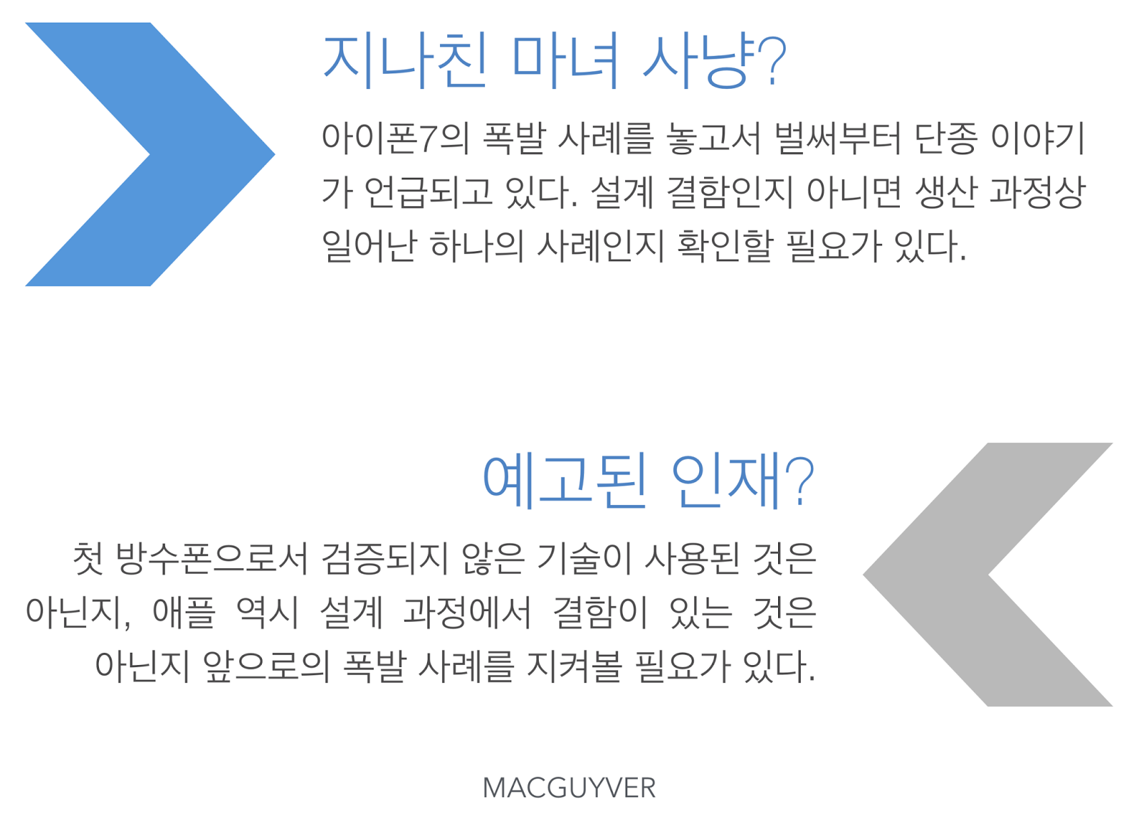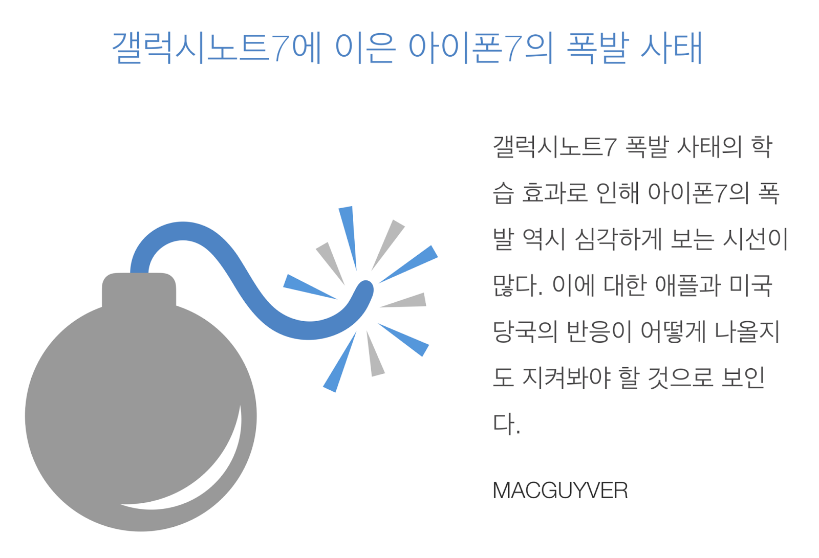 현재의 미국 언론이나 당국은 너무나도 미온적이고 소극적인 태도를 취하고 있다. 그리고 또 다른 팩트는 판매된 절대적인 아이폰7의 숫자와 비교해서 폭발 사태가 적은 것 또한 사실이다. 과연 이번 아이폰7의 폭발이 애플에게 악재가 될지 단순 사고로 남게 될지 앞으로의 폭발 사례에 더욱 관심을 기울여야 할 것 같은 이유다. - MACGUYVER.