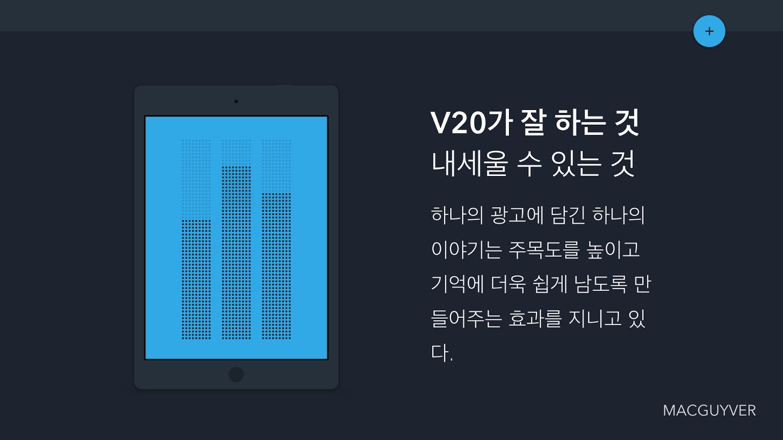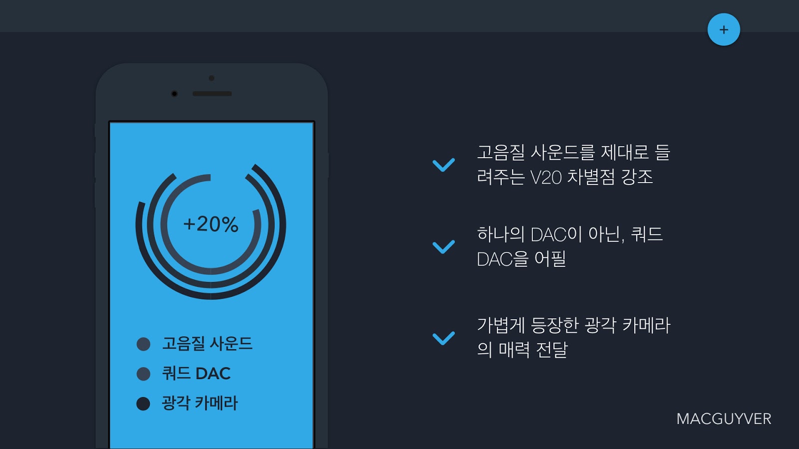 V20를 효과적으로 어필하기 위해 집중한 음질은 분명 V20의 아이덴티티를 전달하기에 충분했음은 틀림이 없다. 또한 카메라 역시 광각으로 촬영되는 것은 V10부터 G5 또한 V20까지 이어지며 하나의 아이덴티티로 굳어지고 있다. 엘지의 최대 공략이 효과를 볼 수 있을지 좀 더 지켜봐야겠다. - MACGUYVER.