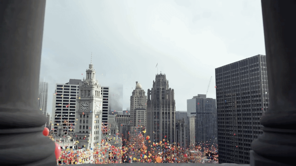 그러나 다리 아래에서 위로 올라온 풍선은 갑자기 수백 개의 풍선으로 불어나 있었다. 그 사랑이 결실을 이룬 것일까? 매우 작고 소박했던 풍선의 꿈은 하나의 풍선 마을을 이뤘고 이러한 풍선은 이제 건물 옆을 가득 채우더니 결국 도심을 가득 채울 정도가 되었다.