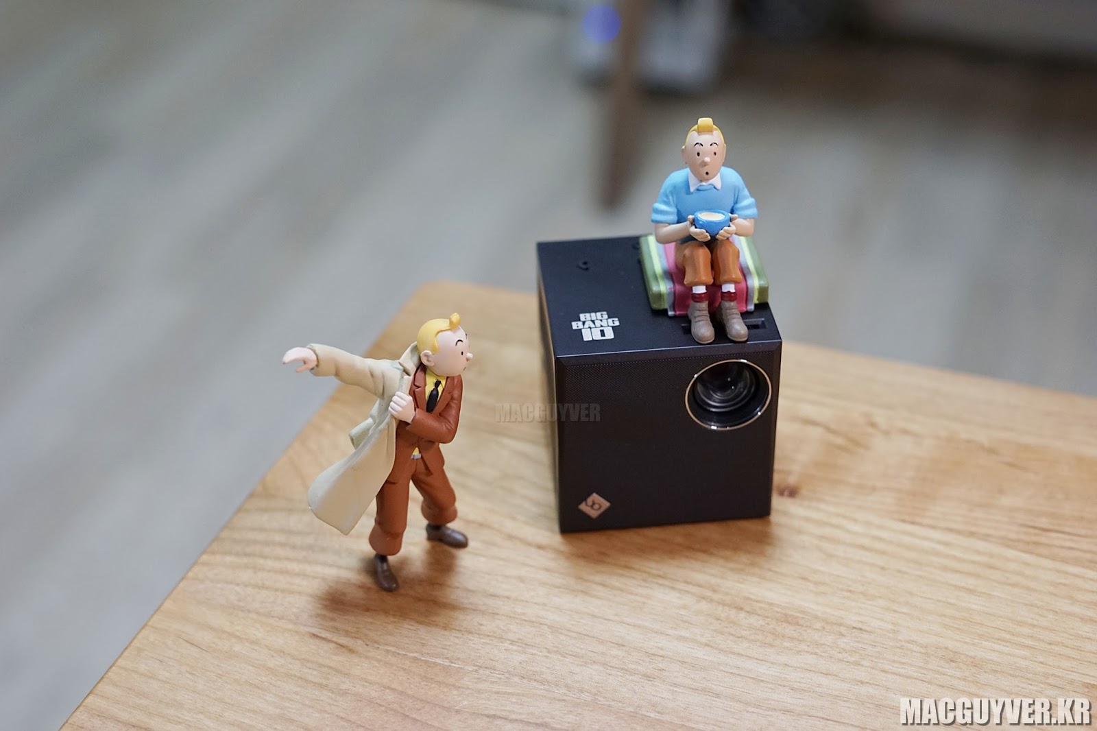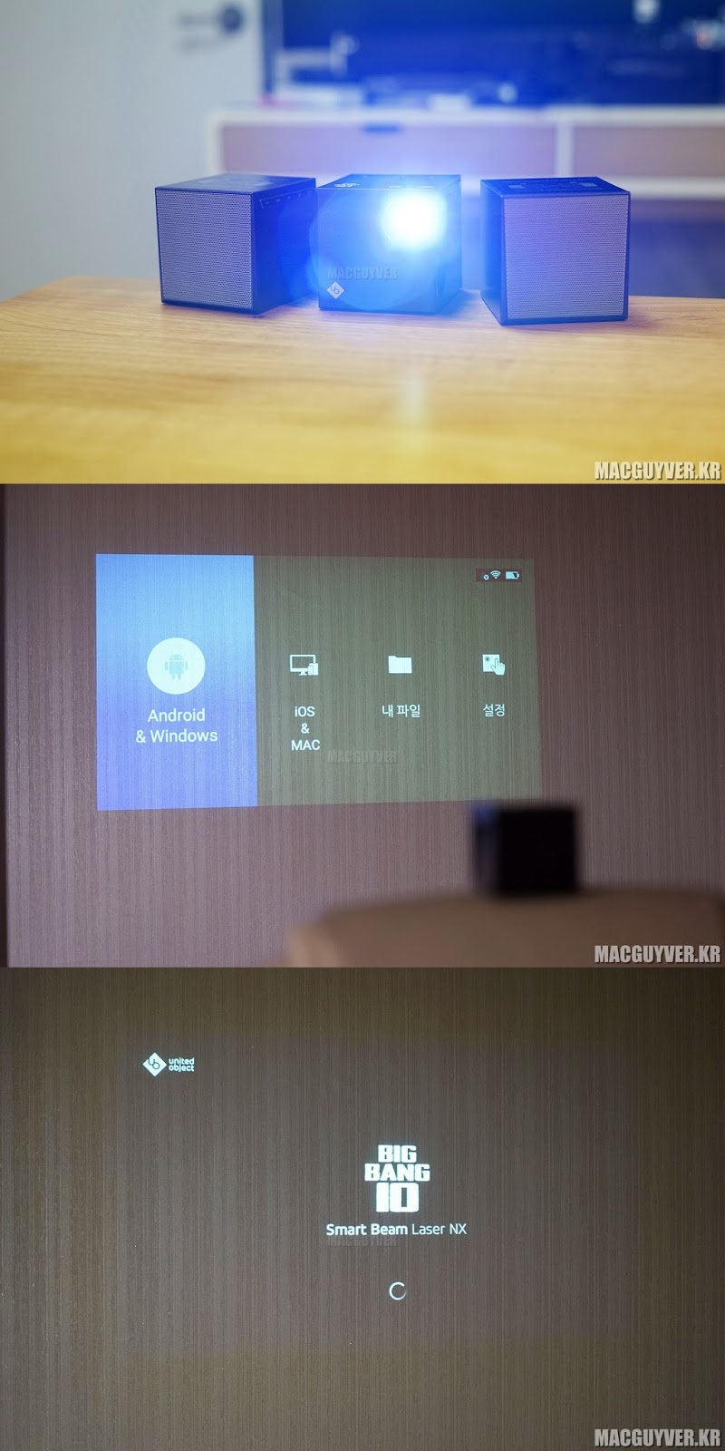 그런 점에서 UO Cube Speaker S와 함께한 스마트빔 레이저 NX는 매우 작은 크기를 지니고 있었고 별다른 설정 없이도 마이크로 SD 카드를 통해 영화를 재생하거나, 혹은 아이폰이나 스마트폰을 바로 연동해서 영상을 재생한다는 점에서 상당히 마음에 들었다.